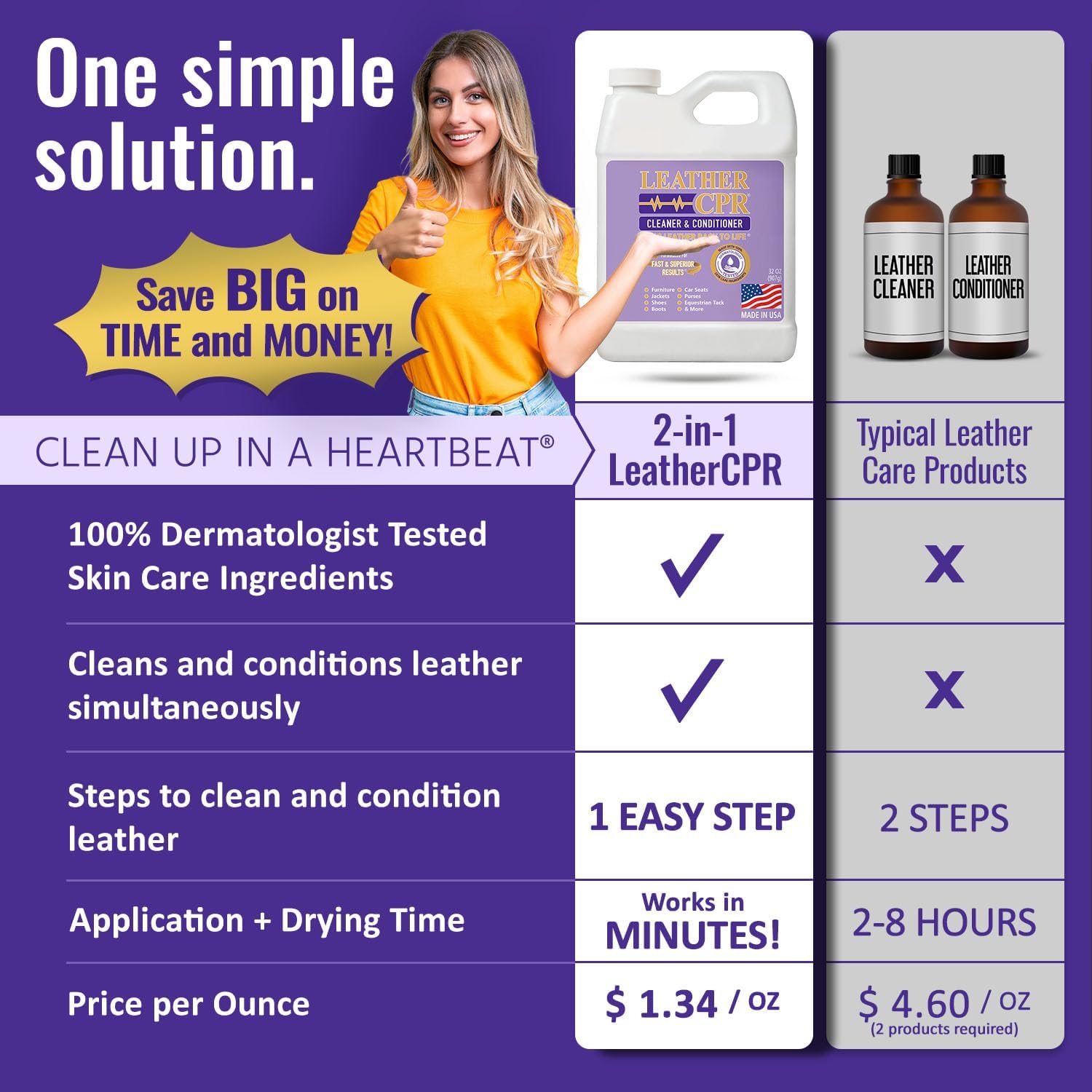 - Fast & Simple One-Step Process: Leather CPR Cleaner and Conditioner makes cleaning fast and easy. Our leather care products cleans and conditions in one easy step to keep your leather products soft and supple for years of enjoyment. No more long process of soaking your leather with a watery spray. Eliminate your waiting time with our leather cream; also good as a car leather cleaner and conditioner, boot cleaning kit, leather restorer for couches, & leather purse conditioner for designer bags.