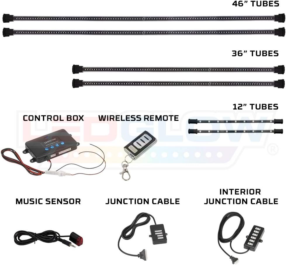 - Includes (2) 46" & (2) 36" Water-Resistant Underbody Tubes that House 378 SMD LEDs, (2) 12" Interior Tubes that House 18 SMD LEDs, Control Box, Wireless Remote, 4-Port Underbody Tube Junction Cable, 6-Port Interior Tube Junction Cable, Music Sensor, Mounting Brackets, Self-Tapping Screws & Zip Ties