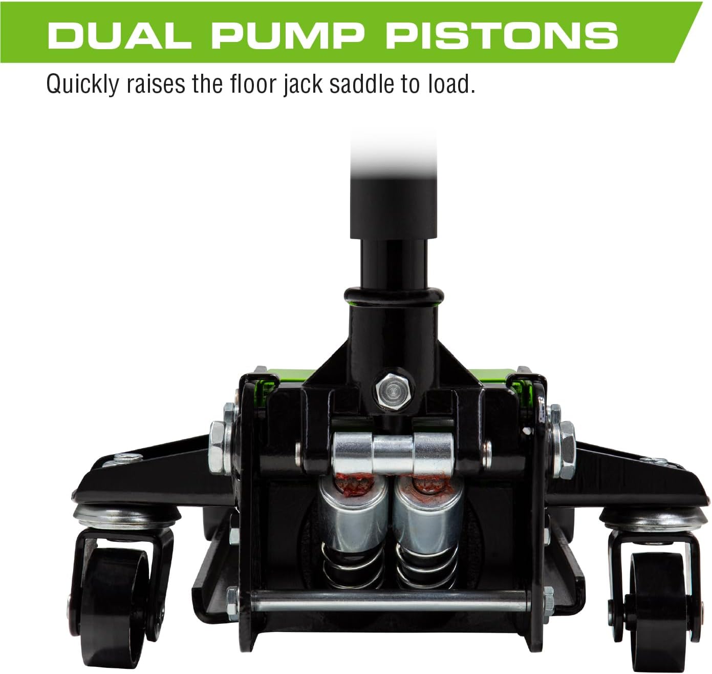- DUAL PUMP PISTONS Quickly raises the floor jack saddle to load
