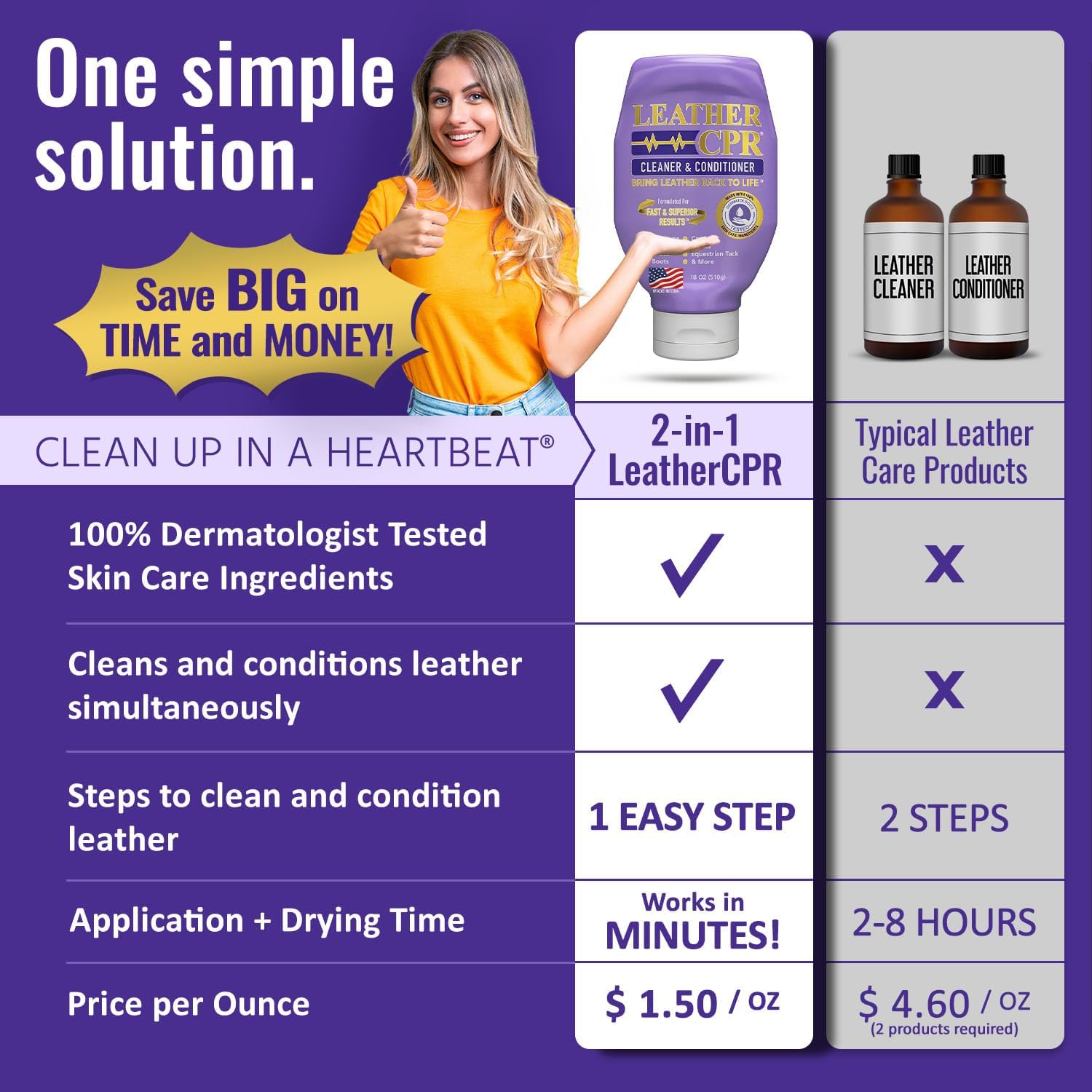 - PREMIUM LEATHER CARE SOLUTION: Leather CPR leather cleaner and conditioner is ideal for maintaining leather’s texture and appearance, from leather couches and furniture to purses and shoes. Whether you need a leather couch cleaner and conditioner, a leather conditioner for purses, or leather cleaner for couches, our product delivers long-lasting results.