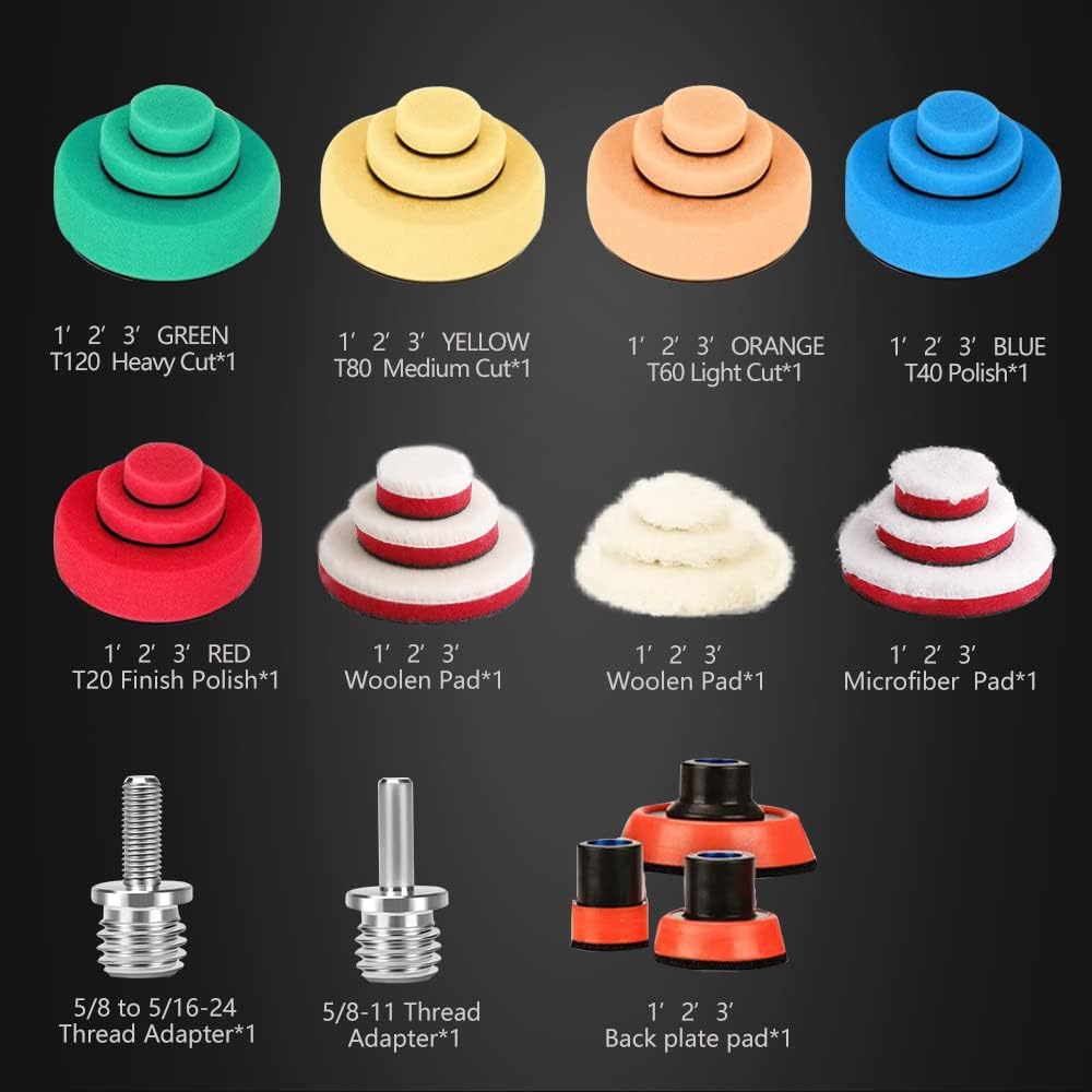 SPTA 29pcs Drill Buffing Pad Detail Polishing Pad Mix Size Kit with 5/8-11 Thread Backing pad & Adapters for Car Sanding, Polishing, Waxing, Sealing Glaze