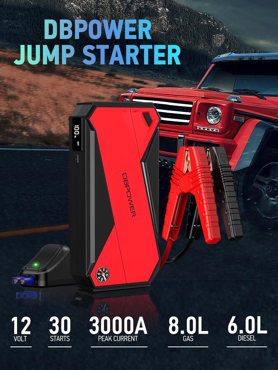 DBPOWER Peak 3000A 18000mAh Portable Car Jump Starter (up to 8.0L Gas, 6.0L Diesel Engine) Battery Booster with Smart Charging Port, Compass, LCD Screen and LED Light (Black/Red)