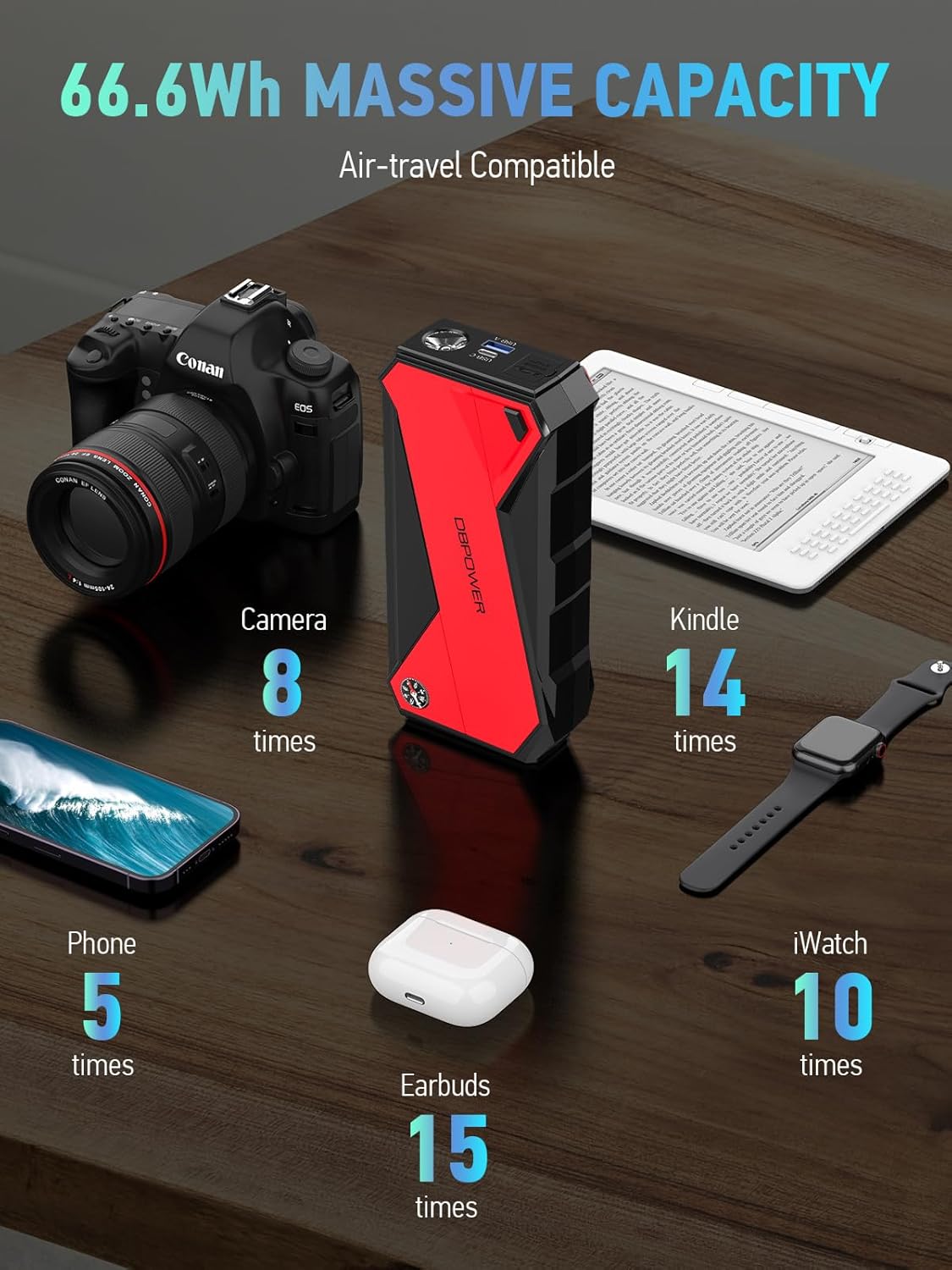 - OVER 10 MILLION UNITS SOLD: DBPOWER has over 10 years of experience in this field, we provide safe and reliable products, 12 months of hassle-free service, and lifetime technical support. Contact us anytime with any questions. The package includes one Jump Starter, one intelligent jumper clamps, one USB charging cable, user guide, jump starter carry case, and user manual.