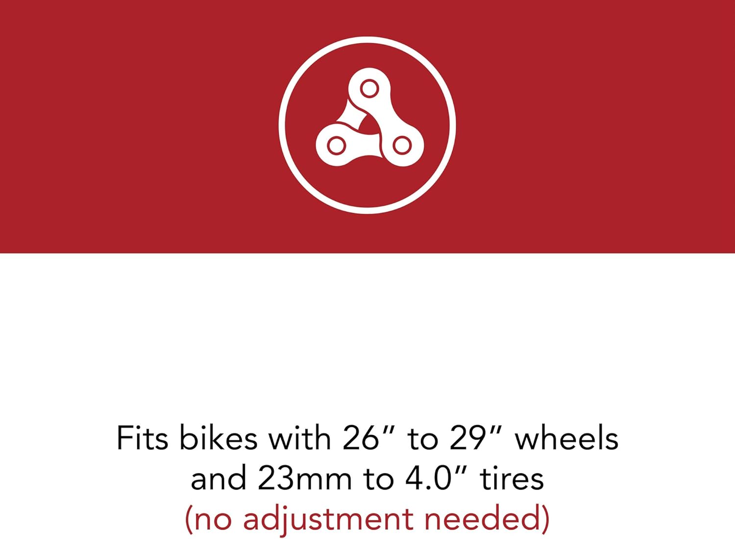 - Reliable Design: Wheel hoop fits 26β to 29β wheels and tires from 23mm to 4.0β with no adjustment needed. Accommodates wheelbases up to 48β, requires no wheel removal, and makes no contact with the bike frame.