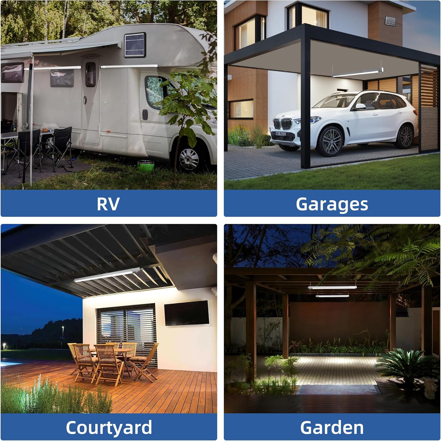 • Energy Efficient:Powered by solar energy, no need for grid electricity. This portable solar power shop light illuminates your carport shed camper or wherever you need it, give bright lightting in locations that don't have direct access to electrical power