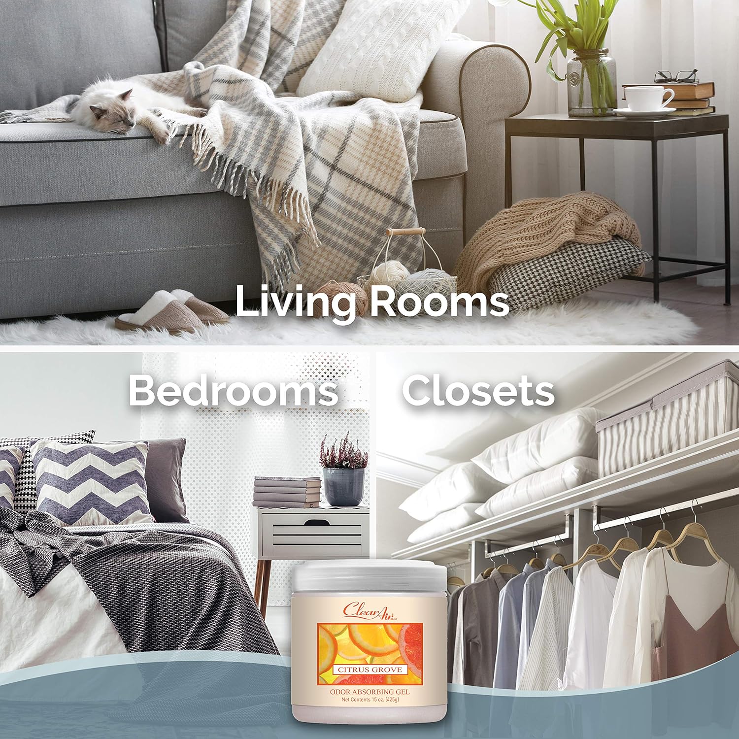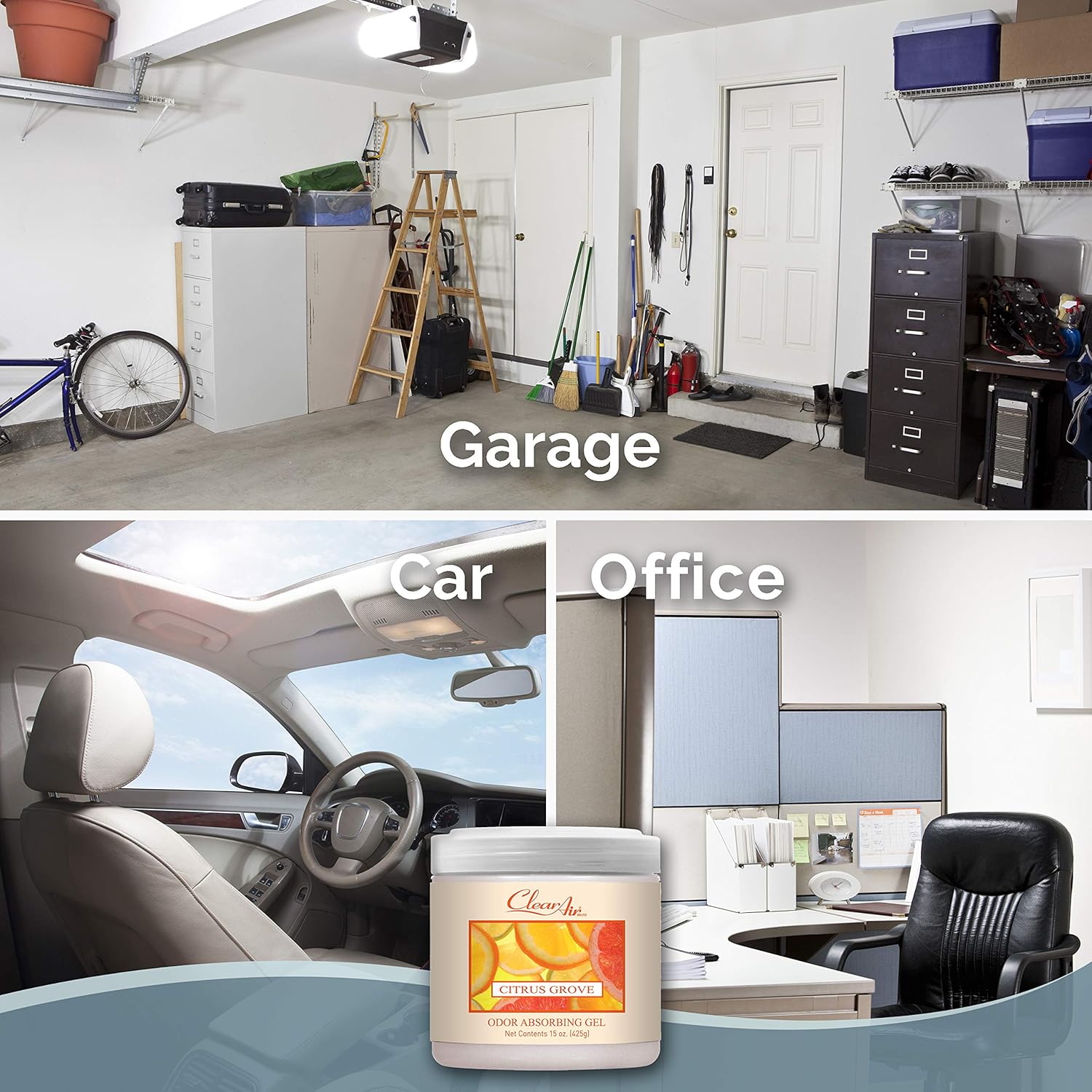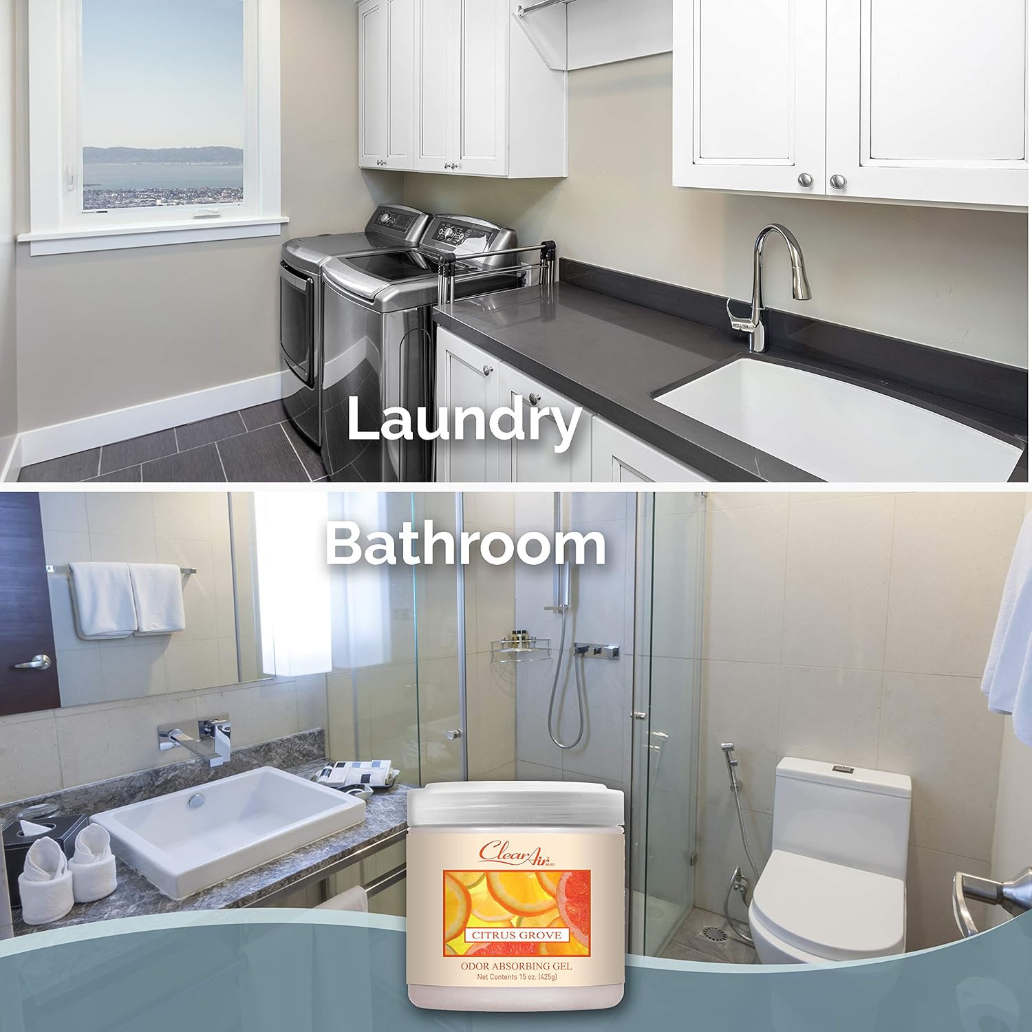 Clear Air Odor Absorber Gel - 15 oz, Pack of 2 - Air Freshener Absorbs and Eliminates Odors in Bathrooms, Cars, Boats, RVs and Pet Areas - Made with Essential Oils - Citrus Grove Scent
