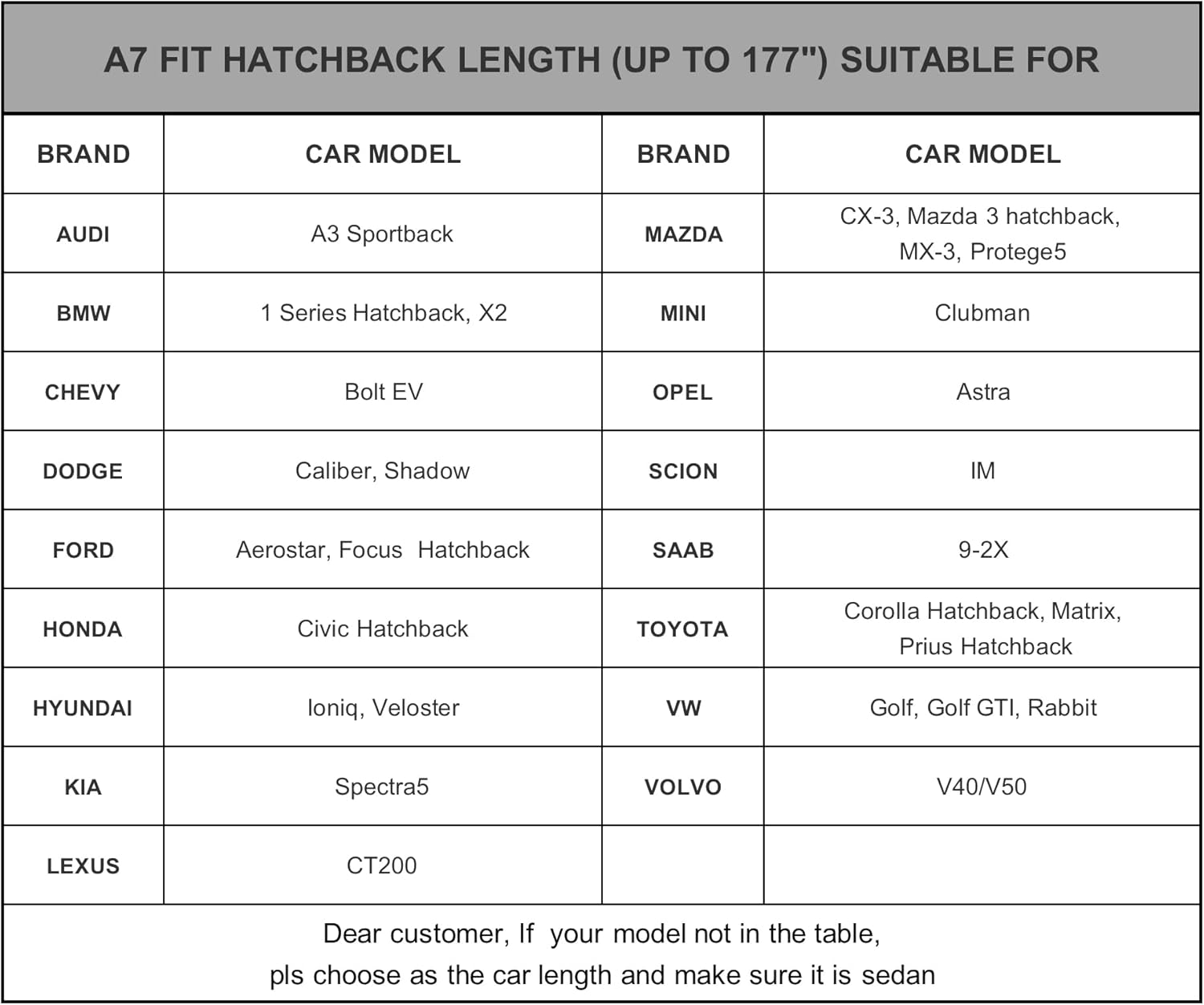- ăDimension A7ăâ Universal fit for hatchback which length is up to 177 inch (NOT FOR SEDAN AND SUV). Suitable for VW Golf/Gti/Rabbit, Mini Clubman, Toyota Matrix, Honda Fit, BMW 1 Series/X2, Lexus CT200, Hyundai Veloster, Ford Focus hatchback, Chevy Bolt, Audi A3 hatchback etc.