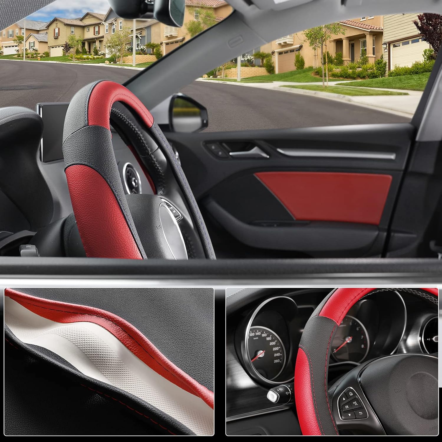 - NO MORE STICKY: The auto steering wheel cover is comfy to hold, it absorbs the hand-sweat that the summer heat causes, and allows you to grip the steering wheel much better.