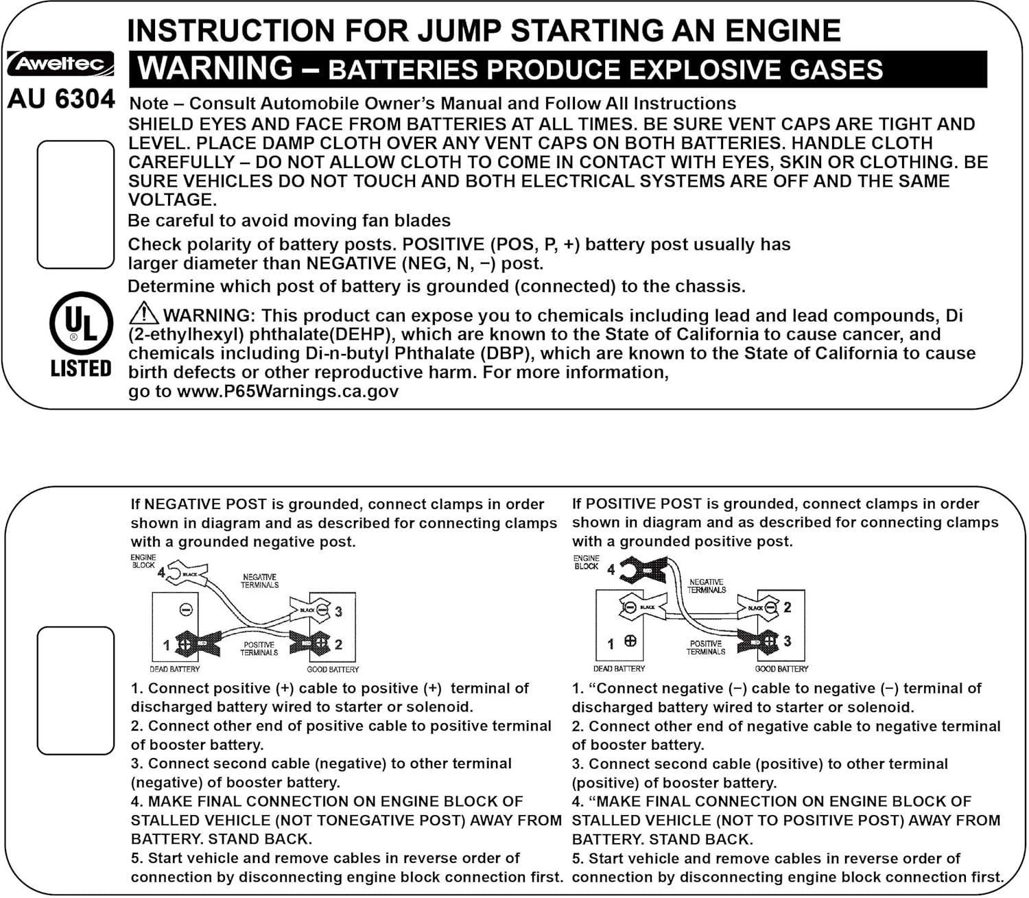 - AWELTEC UL-Listed Jumper Cables - 6 Gauge 16 Feet Automotive battery jumper cables for jump starting a dead or weak battery. High density copper clad aluminium make it has excellent conductivity. Perfect for most motorcycles, cars, SUVs and trucks with up to 5.0 L gas and 3.0 L diesel engine.