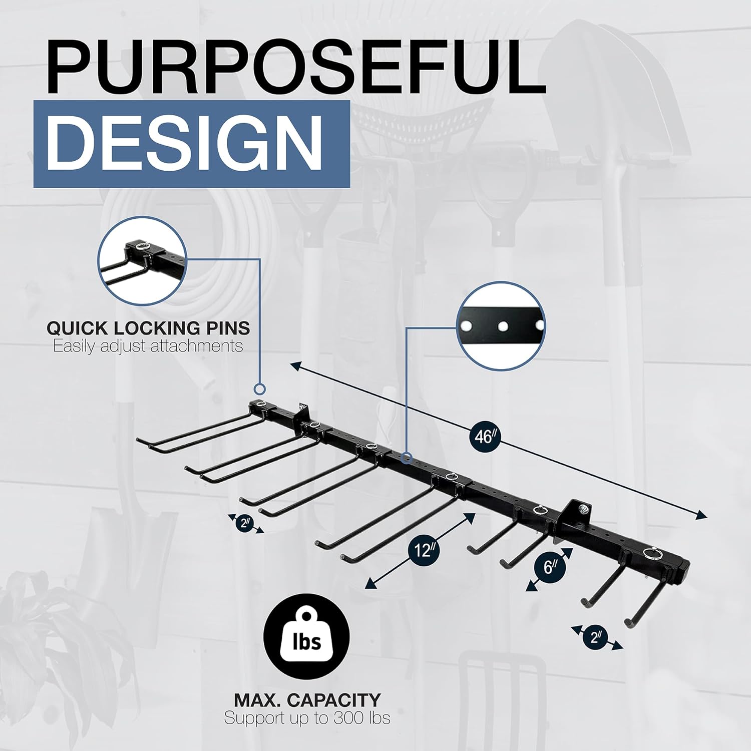 - Includes 6 Garage Storage Hooks – Includes 4 large (12" x 2") and 2 small (6" x 2") tool racks for garage walls. Hang ladder hooks, garage hooks, rakes, gardening forks, mattocks, pole hole diggers, and more. This garden tool organizer wall mount offers flexible, space-saving storage for all your garage needs.