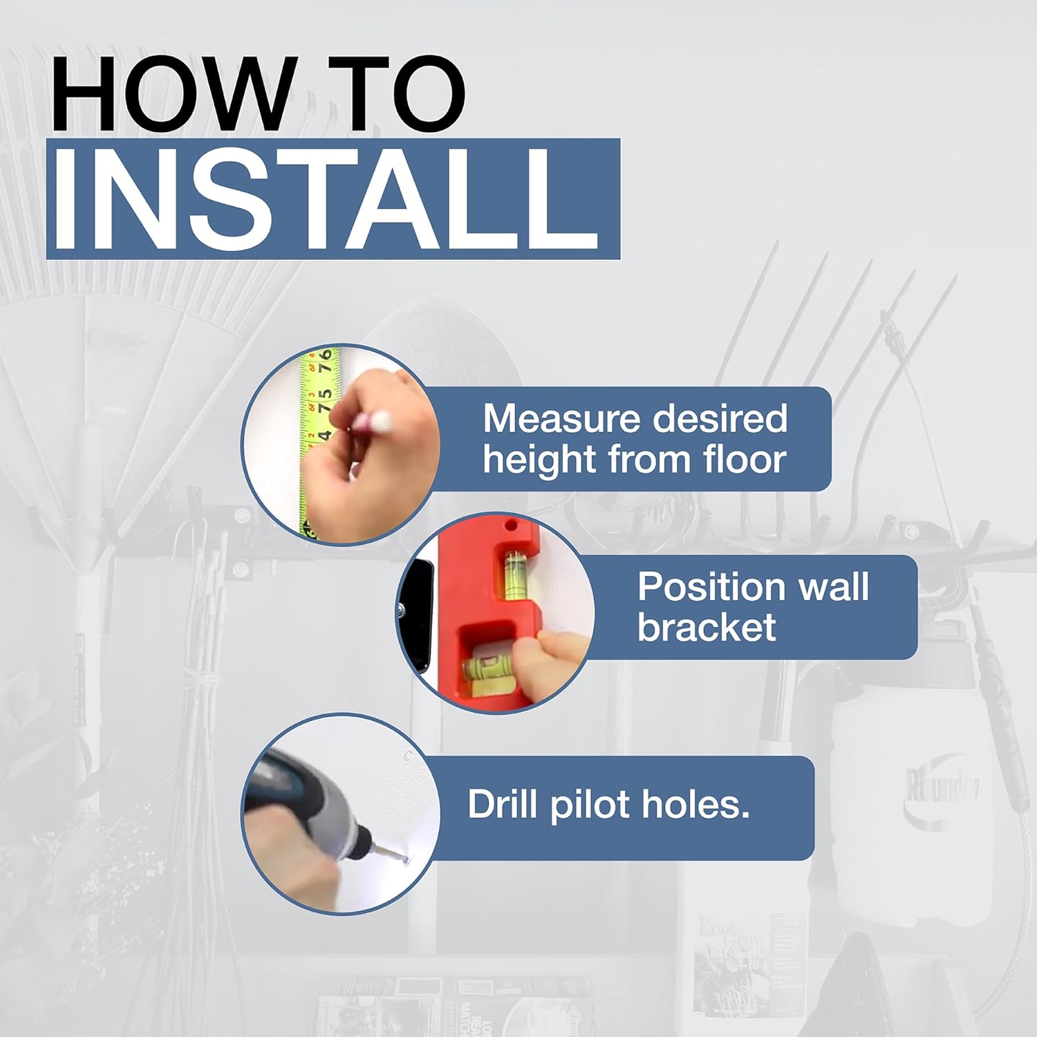- Maximum Tool Storage Capacity – Organize your garage with this wall mount garage tool organizer designed to hold a wide variety of equipment. Store garden tools, shovels, rakes, brooms, power tools, extension cords, hoses, and even bulky items like wheelbarrows and chainsaws. Clear up floor space and keep your gear accessible for your next project with this all-in-one garage organization system.