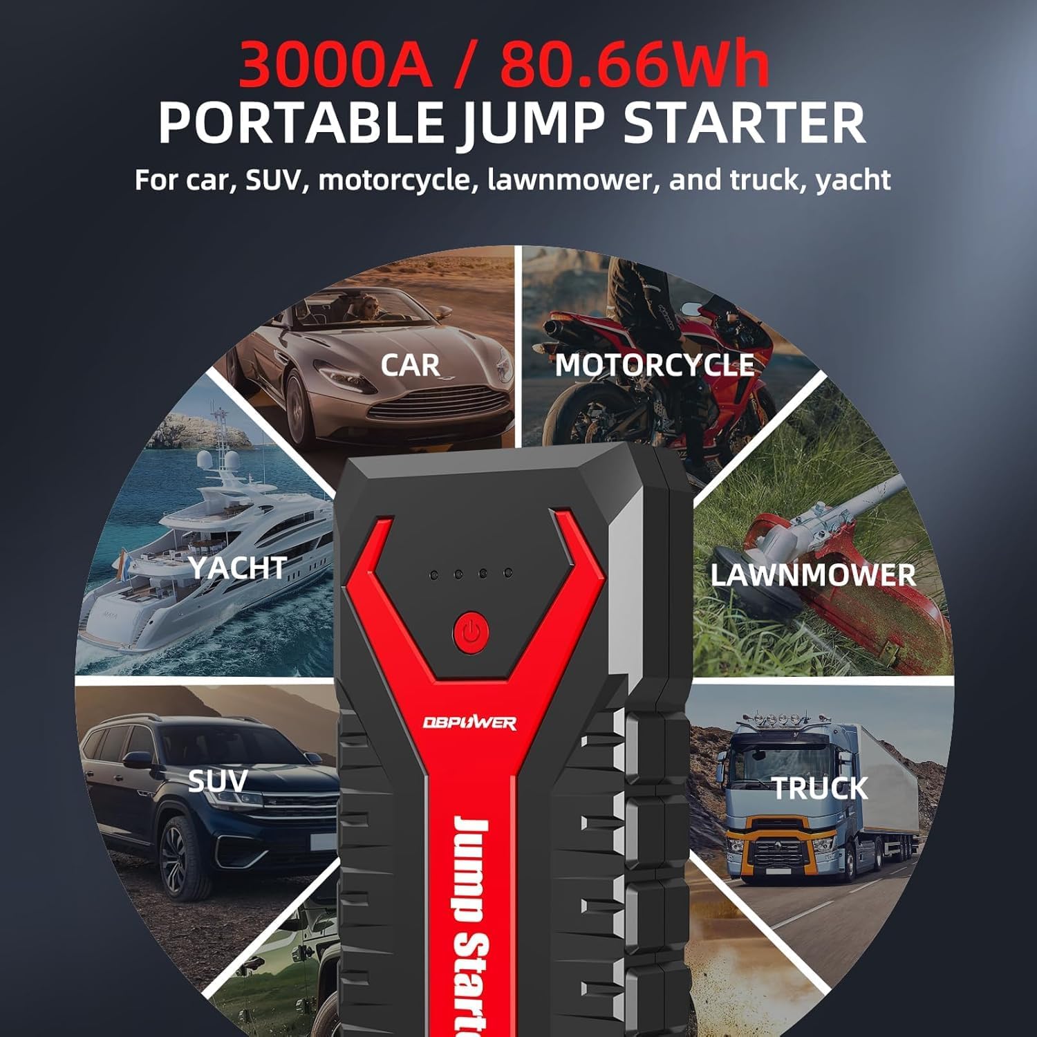 DBPOWER 3000A/80.66Wh Portable Car Jump Starter (UP to 10.0L Gas/8.0L Diesel Engines) 12V Auto Lithium-Ion Battery Booster with Smart Clamp Cables, Quick Charge, and LED, Storage Bag