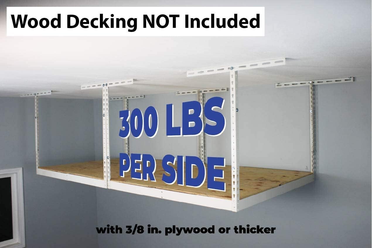 - IMPORTANT REMINDER: Our Overhead garage storage rack frame kit DOES NOT come with wire decks. Decks are NOT included. We recommend that a 3/8" thick plywood be used as adequate decking material for this garage ceiling storage rack to maximize it's storage weight capabilities.