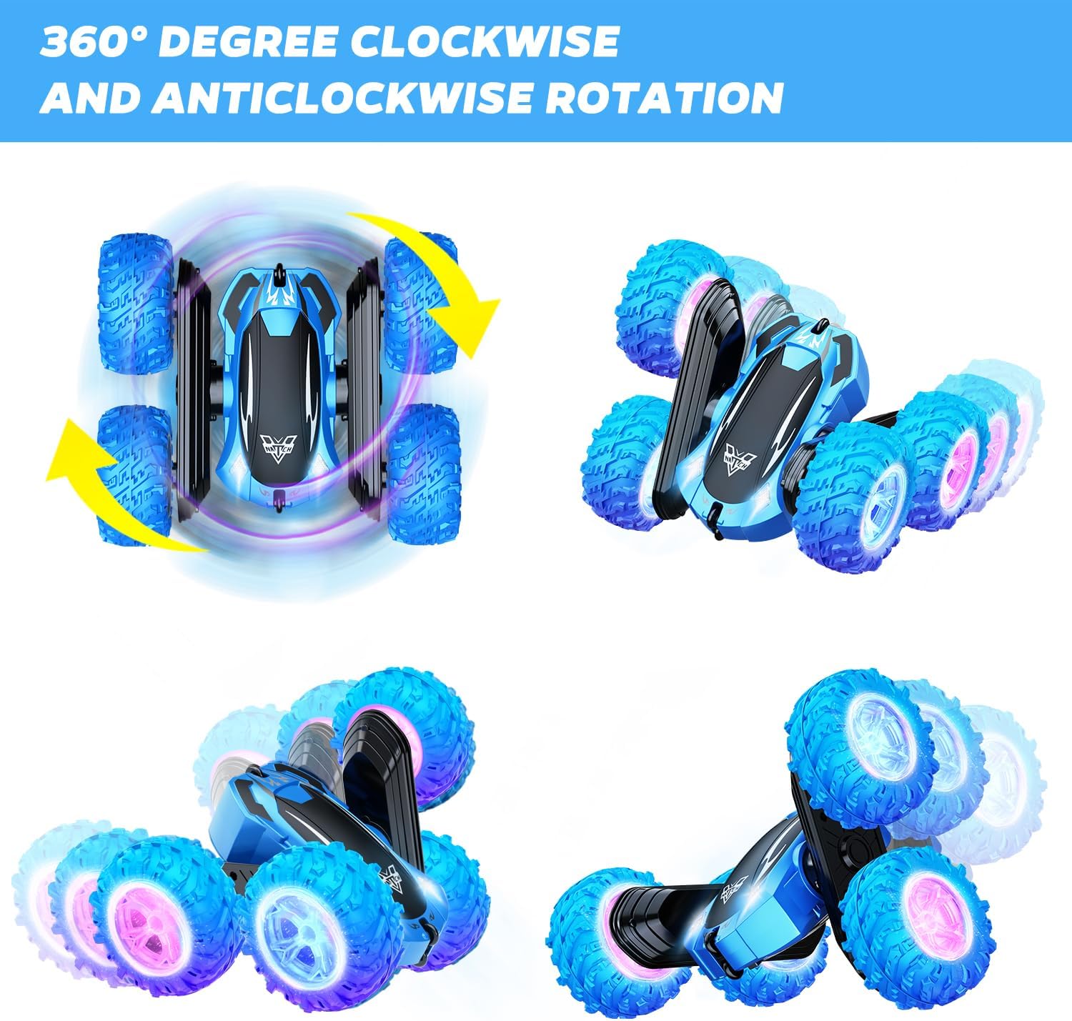 KKONES Remote Control Car, 2.4GHz Double Sided 360° Flips Rotating Electric Race RC Stunt Car, LED Wheel & Headlight High Speed Off Road Cars Toy Gift for 3 4 5 6 7 8-12 Year Old Boy Toys (Blue)