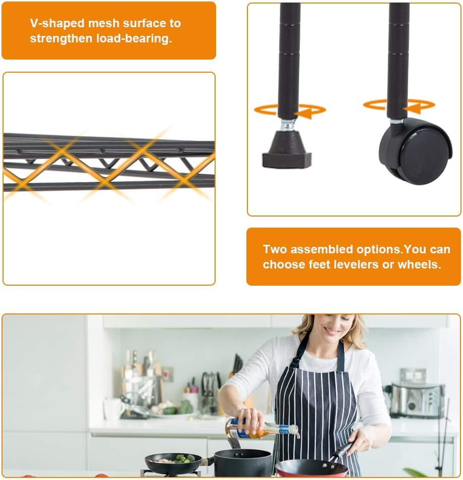 - âăLARGE AND STURDYăïŒThe wire shelving unit provide an enormous amount of space and strong shelves. The metal shelf doesn't occupy too much space,but it can create more additional space. The storage shelves use durable steel construction,and to resist dirt buildup and corrosion. Maximum weight capacity per shelf is 150lbs when equally distributed on feet levelers.Maximum entire unit weight capacity is 220lbs when equally distributed on casters.wire shelving unit metal shelf storage shelves.