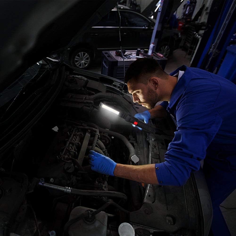 - 【5 Working Modes & Waterproof】Super bright COB light has 5 Lighting modes: High Brightness / Medium Brightness / Front Light / Red Warning / Strobe Red. Press for 3 seconds to switch COB red light. IP44 Waterproof rating, ensure the rechargeable work light works fine in rainy days