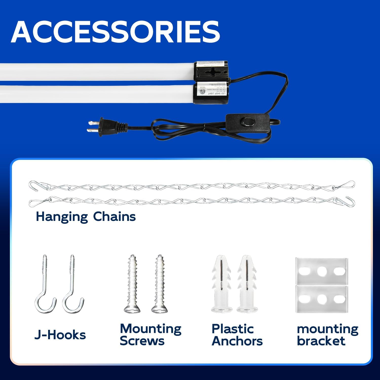 - ā Easy Installation - Plug & Play. Come with 59" power cord with on/off switch and other small accessories. You can hanging it with the included hanging chains or directly mounted to the ceiling with the included mounting screws.