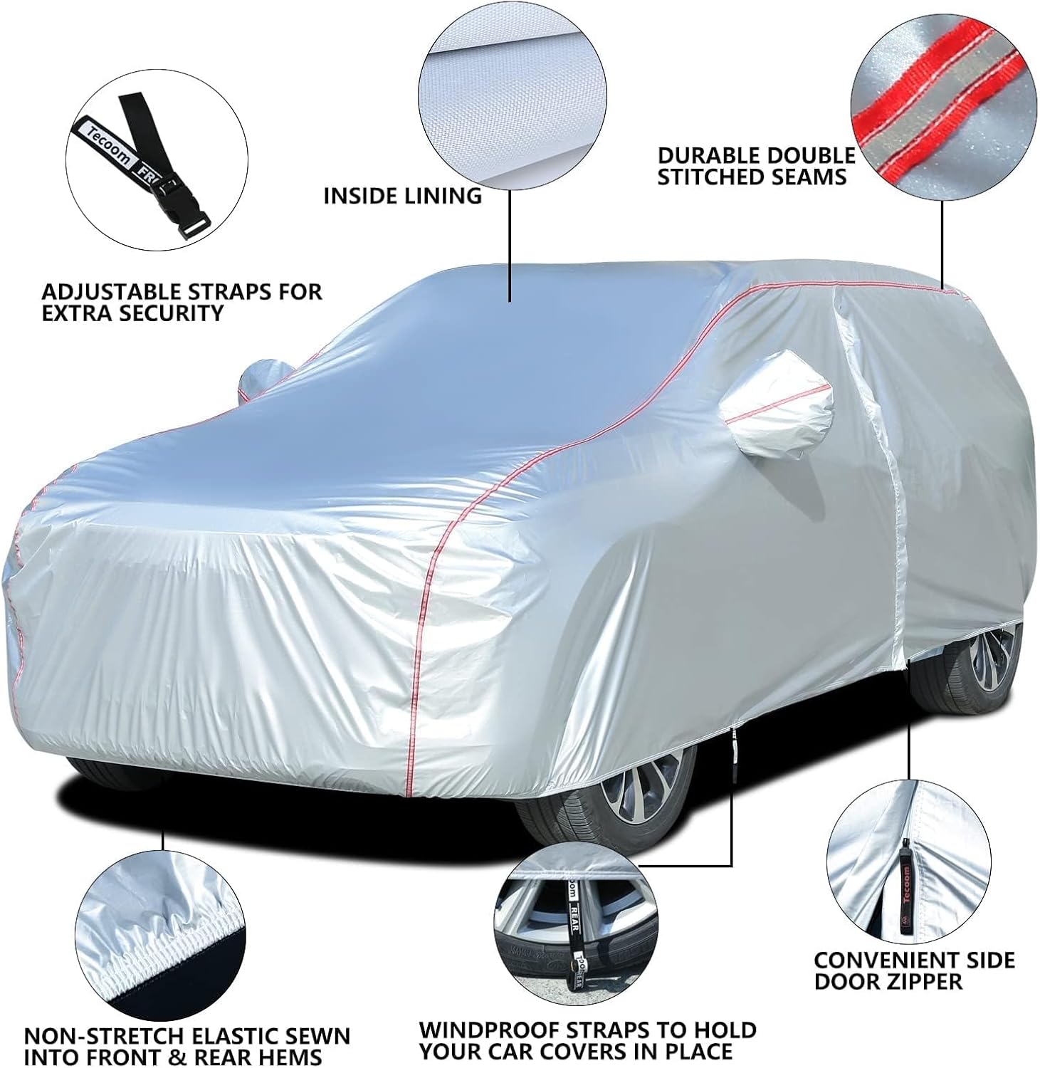 - ăAll Weather ProtectionăTecoom car covers is perfect for indoor and outdoor use, no matter the sun or the cold weather, protects your car safe from UV rays, snow, rain, frost, sand,dust, leaves, branches, birds dropping.