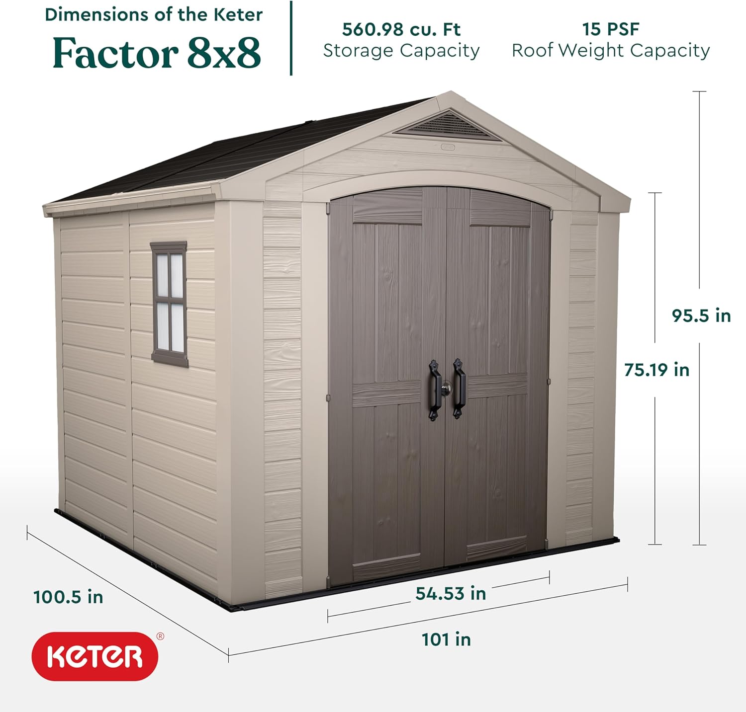 Keter Factor 8x8 Foot Large Resin Outdoor Shed with Floor for Patio Furniture, Lawn Mower, and Bike Storage, Taupe & Brown
