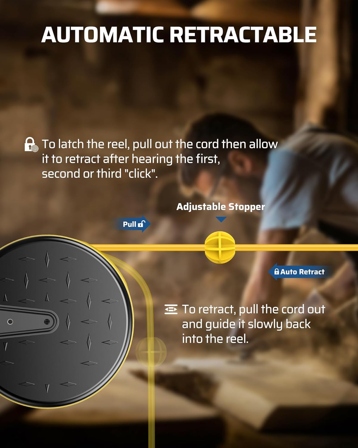 - 【 Automatic Retractable 】 The power cord reel retracts quickly and smoothly with a clever auto-guide rewind mechanism to avoid kinks and tangles; the ratcheting system will lock the cord at any length and allow you to quickly store it when finished