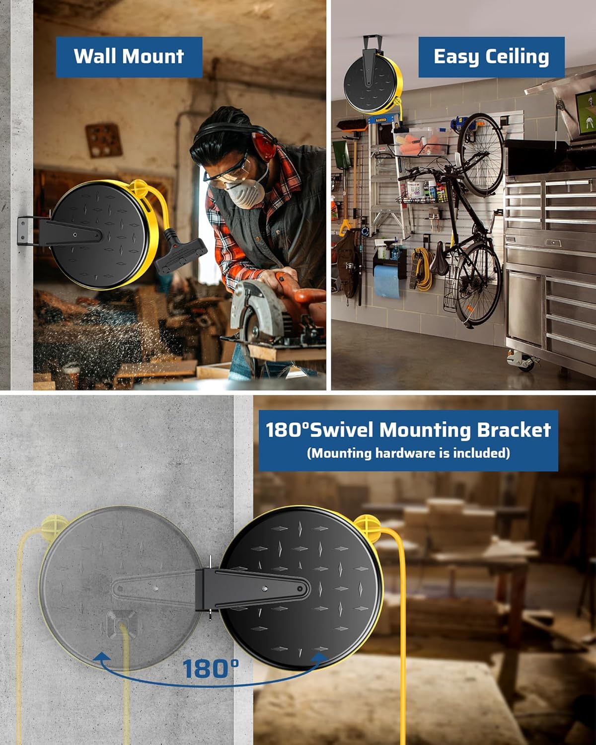 - 【 Easily Ceiling / Wall Mount with 180 Degree Swivel】 The swivel mounting bracket lets the extension cord reel swivel freely up to 180 degrees; perfect for hanging from your garage ceiling or mounting to a wall;easily pull and release cord from multiple directions; free up more work space and makes storage a breeze; avoid tangled cords or people tripping up