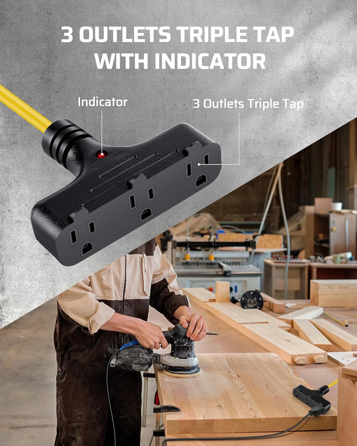 - 【 3 Grounded Outlets Triple Tap with Indicator Light 】 The grounded triple tap pigtail allow you to power multiple appliances simultaneously and maximize the usage of power strips and wall outlets; indicator lights up when the cord is powered to let you know the electrical cord reel is ready to use