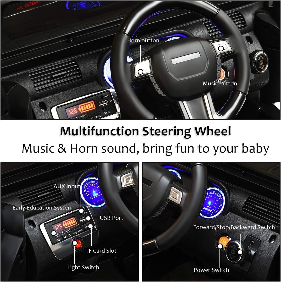 - Attractive and Fun Function: With forward and reverse functions and three speeds on remote control for adjustment, children will gain more autonomy and entertainment during play. Equipped with MP3 player, AUX input, USB port & TF card slot, this electric truck is able to be connected to your device to play music or stories. Brings extra surprise to your baby.