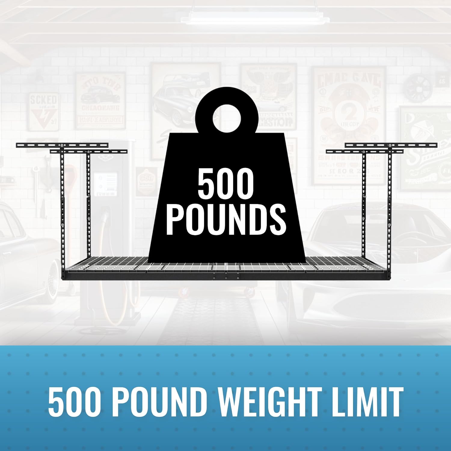 - INDUSTRIAL STRENGTH RACKS: Our industrial strength garage ceiling storage rack is designed to hold up to 500 lb per rack and is perfect for storing bikes, construction tools, storage bins, holiday decorations, and other items and accessories. The powder coat finish provides a durable, scratch, water, and rust-resistant surface; while case-hardened hardware and our patented ceiling brackets provide additional strength and safety for this hanging shelf.