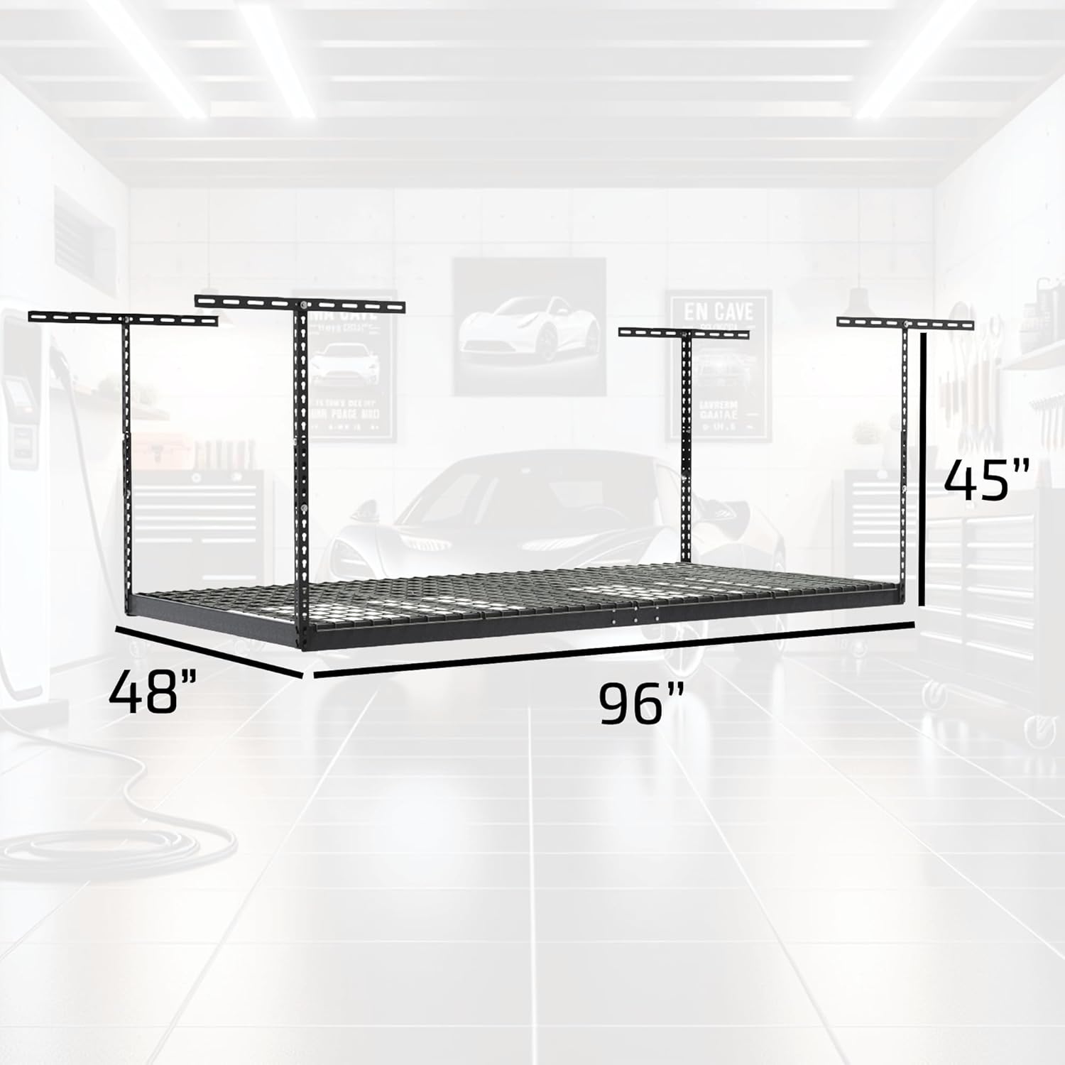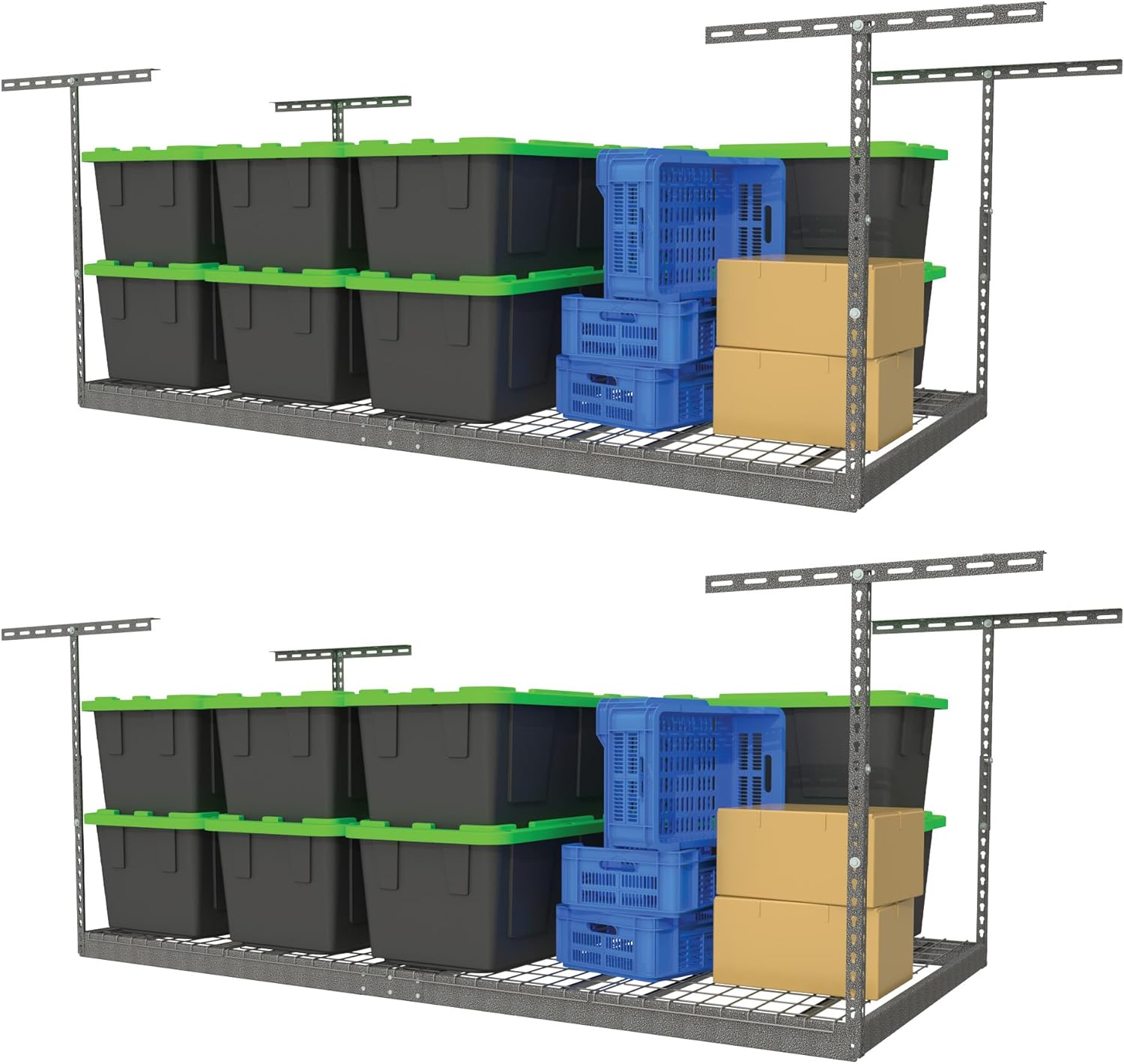 - MORE STORAGE, LESS CLUTTER: Designed with your storage needs in mind, ceiling mounted overhead garage storage helps you get organized by getting your things off the floor and out of the way saving valuable space in your garage. This hanging storage system is a great space saver; allowing you to utilize previously unused space providing you more storage and better organization.