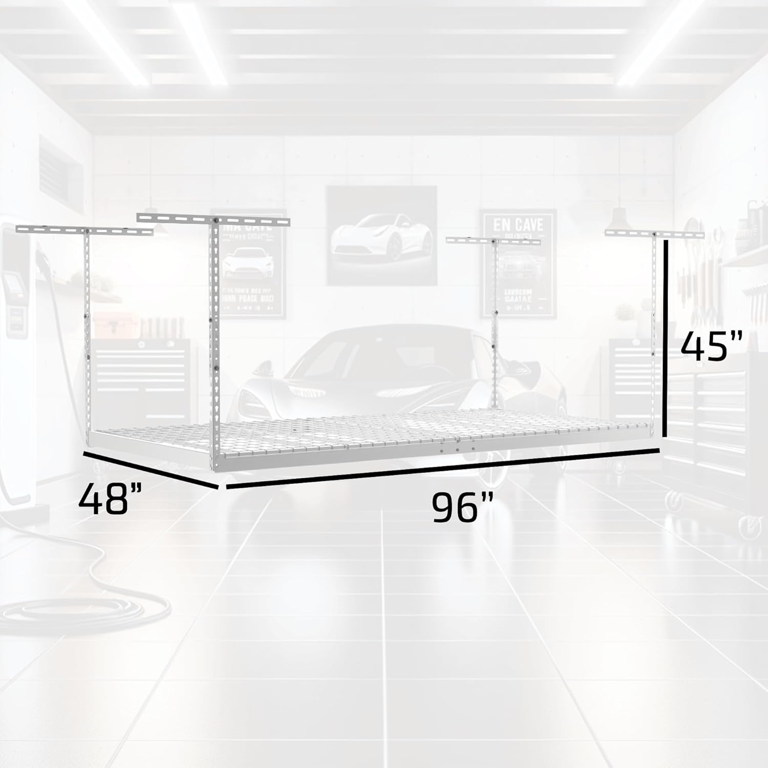 - MORE STORAGE, LESS CLUTTER: Designed with your storage needs in mind, ceiling mounted overhead garage storage helps you get organized by getting your things off the floor and out of the way saving valuable space in your garage. This hanging storage system is a great space saver; allowing you to utilize previously unused space providing you more storage and better organization.