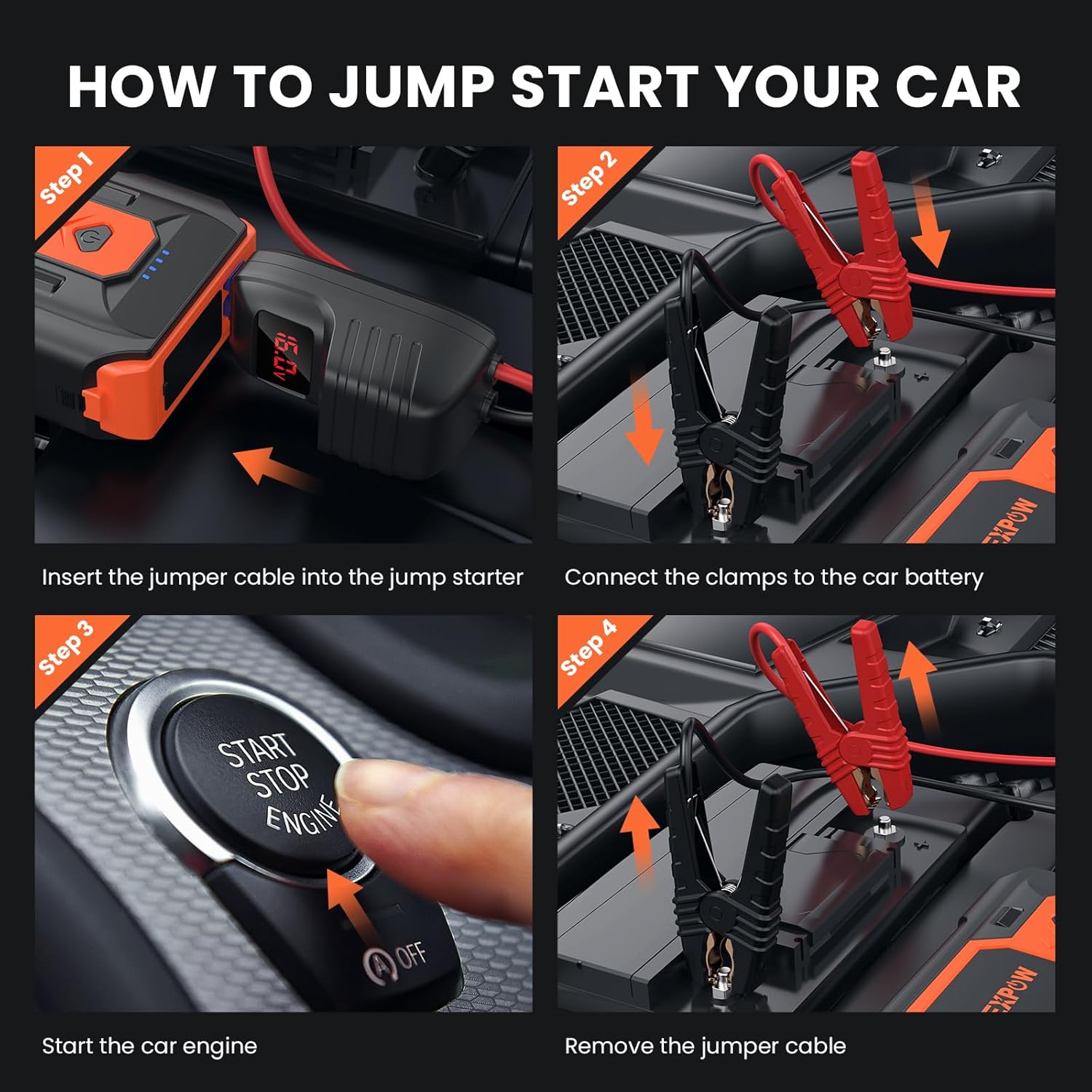 - What's Included: NEXPOW Q9B car battery starter, smart-jumper cables, USB Type-C cable, cigarette lighter socket adapter, user manual, carrying case