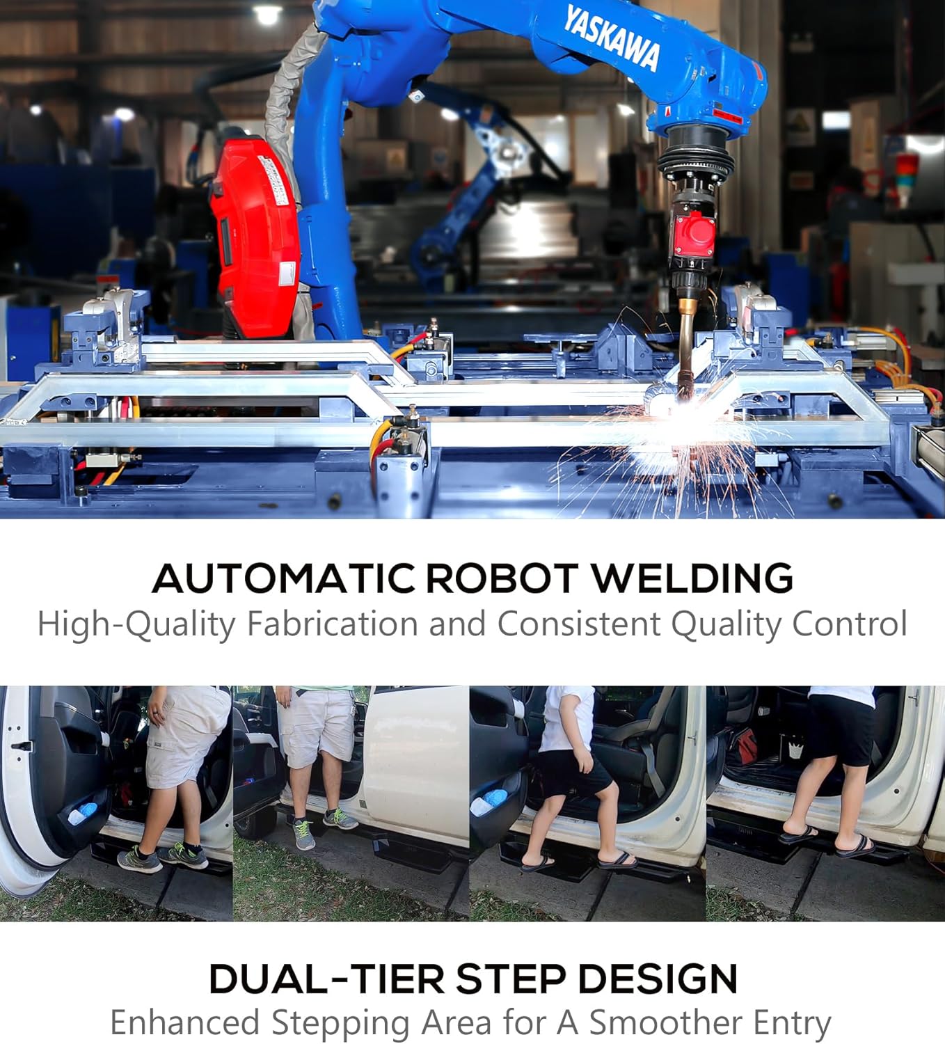 - Made of Stainless Steel square tube and drop step pads, triple-layer black powder coated finish for aggressive tough look.