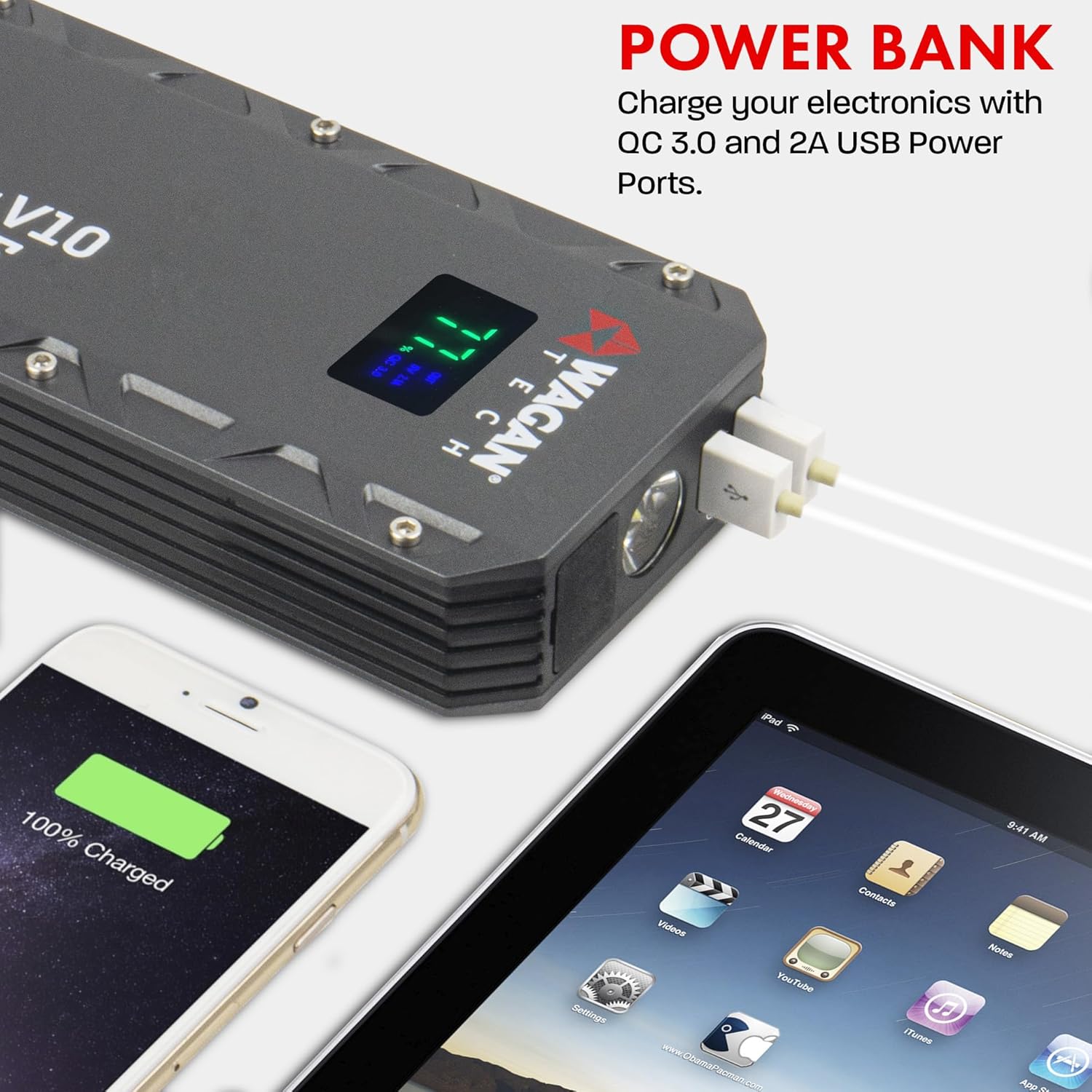 - ăGREAT JUMP STARTER WITH MULTIL FUNCTIONă - It's a car jump starter, portable power bank, and LED flashlight. It has QC3. 0 and 5V 2. 0A ports to recharge smartphones, tablets, and other US