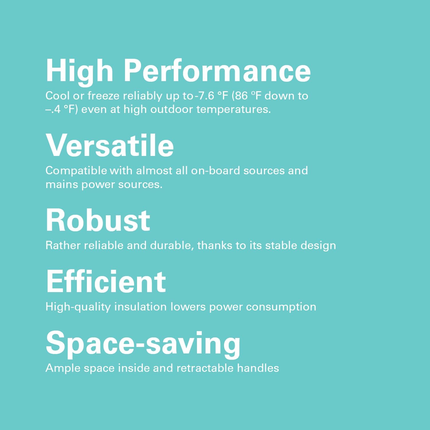 - EFFICIENT & QUIET – From 50ºF to -8ºF degrees, any temperature is possible. Thanks to excellent insulation, the Truma cooler remains chilled for a long time, even when there is no power supply nearby. It runs with a low-noise operation over long time periods and can be powered via car battery, solar power, portable charger, mains power or a Truma Battery Pack.