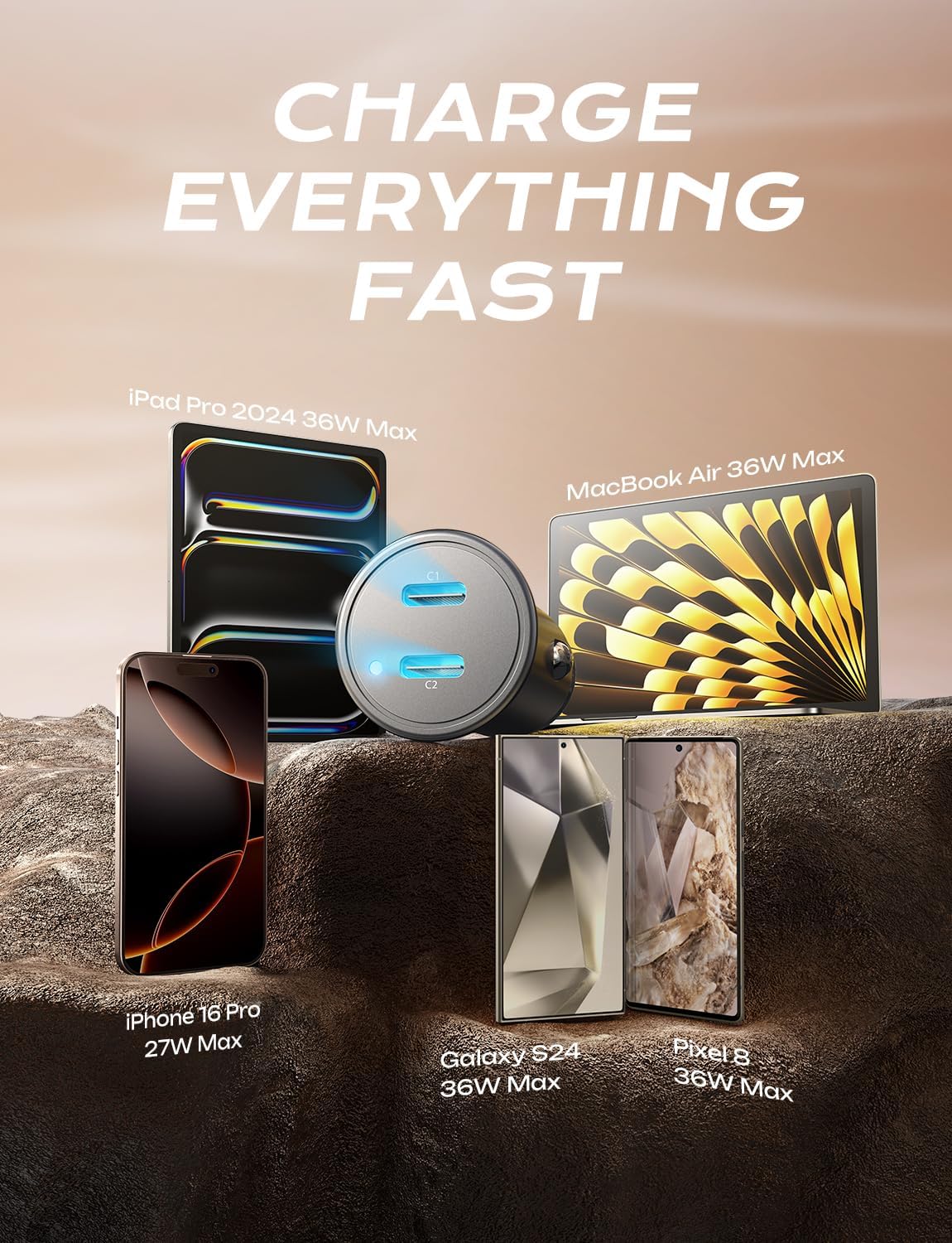 - ALL METAL CASE, WON'T MELT: This dual USBC car charger is made of high-density zinc alloy case, which can help the car charger dissipate heat more quickly during charging. Compared with plastic car chargers, it effectively improves charging efficiency by about 15% and is safer than plastic iphone 16 car chargers. The all-metal body also has a unique sense of design and luxury texture