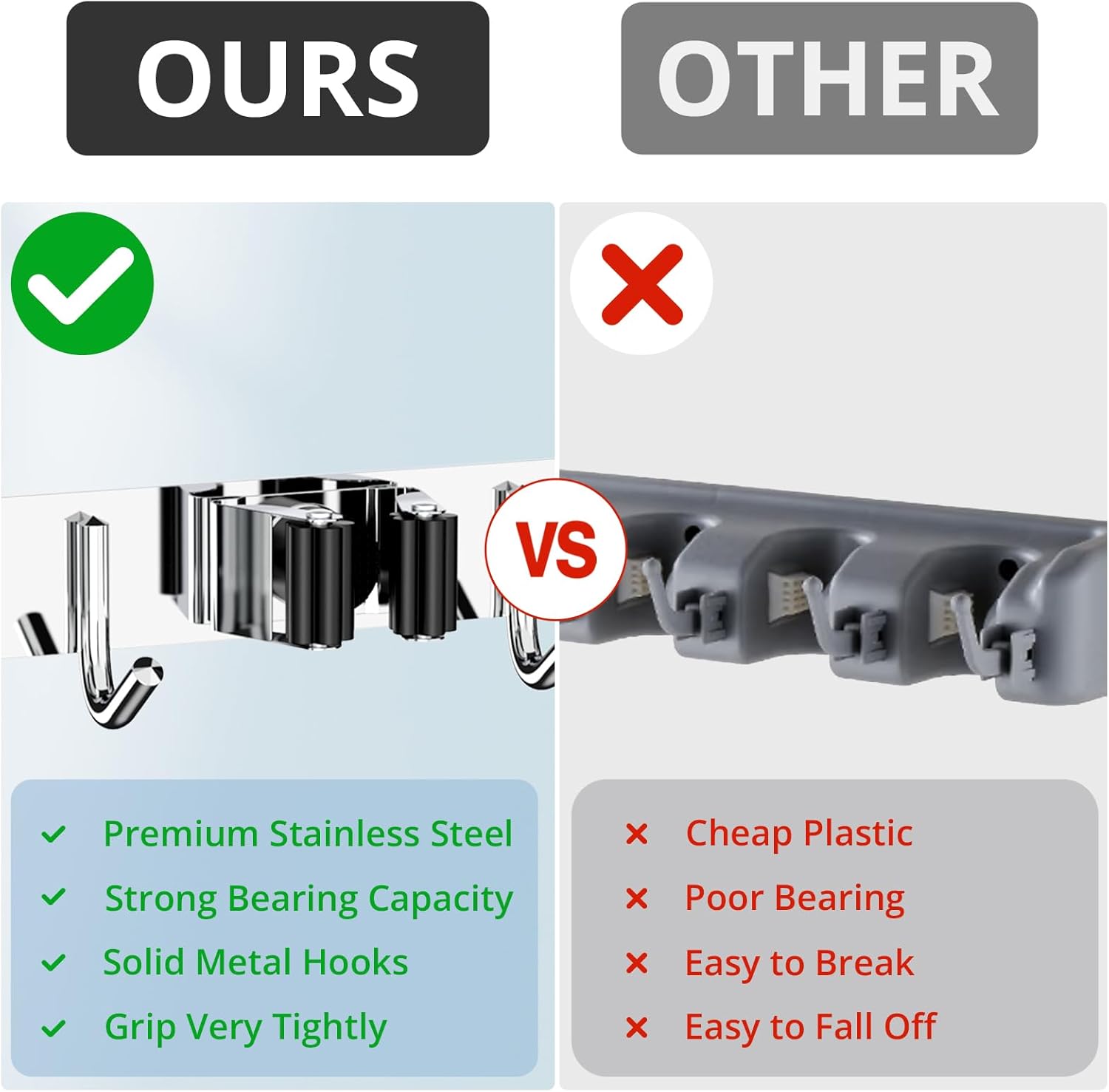 - 🏡【STURDY BROOM HOLDER】Each broom holder wall mount has 3 racks 4 hooks. Made of sturdy 304 stainless steel, the broom holder is corrosion-resistant, rustproof and waterproof. Compared with the plastic broom rack, it is more stronger and has a longer service life.