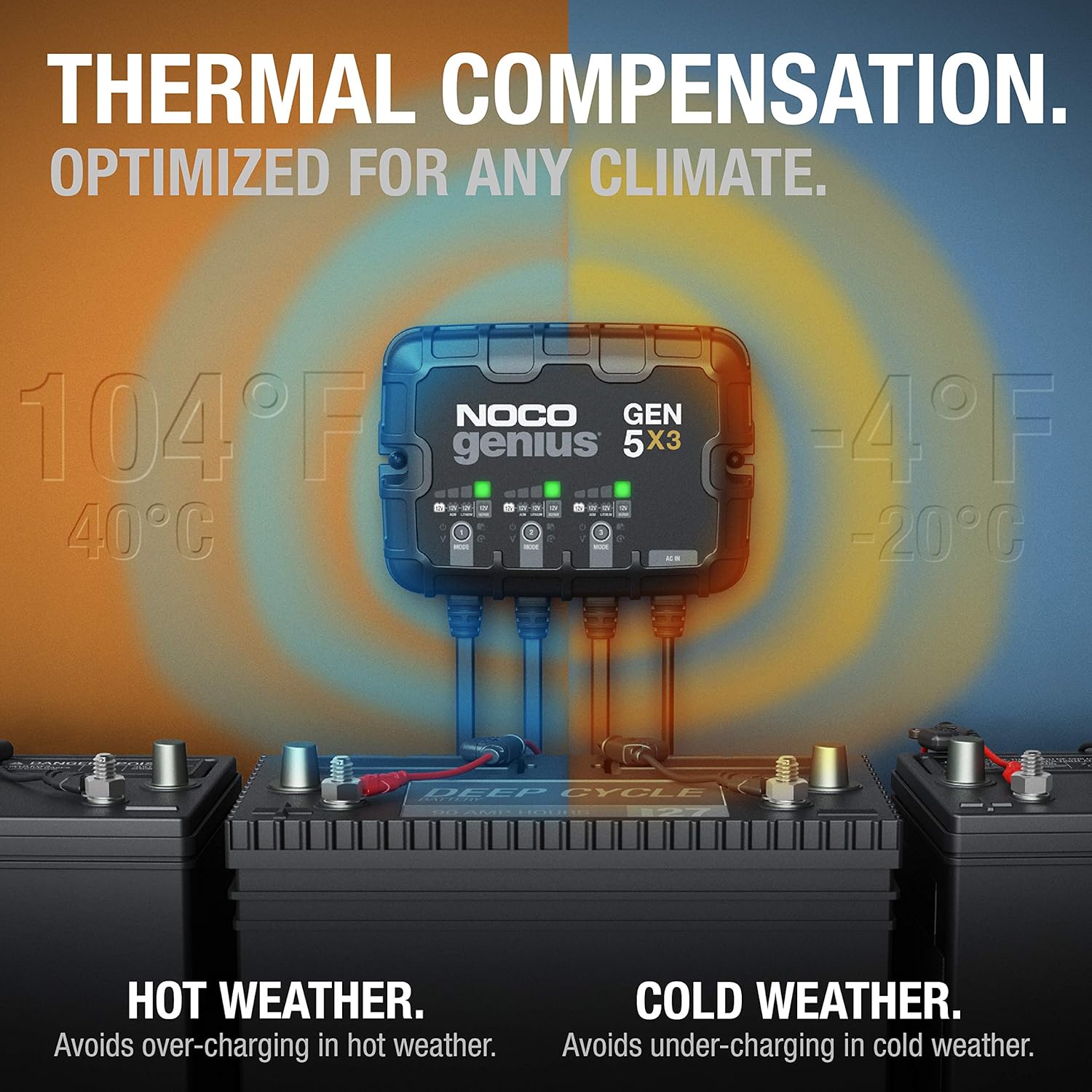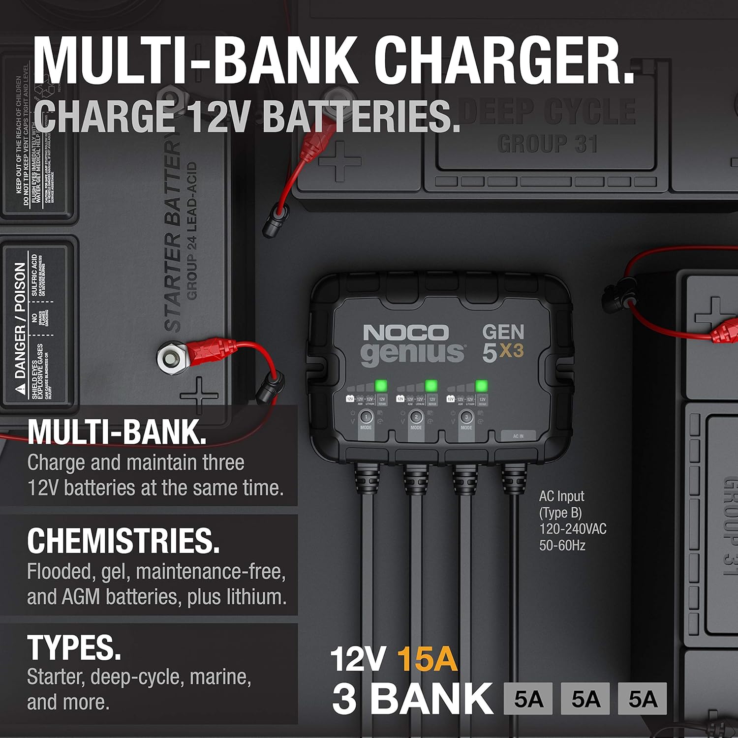 NOCO Genius GEN5X3: 3-Bank, 15A Onboard Battery Charger - 5A Per Bank, 12V Waterproof Marine Charger with Overcharge Protection & Temperature Compensation – for Lead-Acid & Lithium Batteries