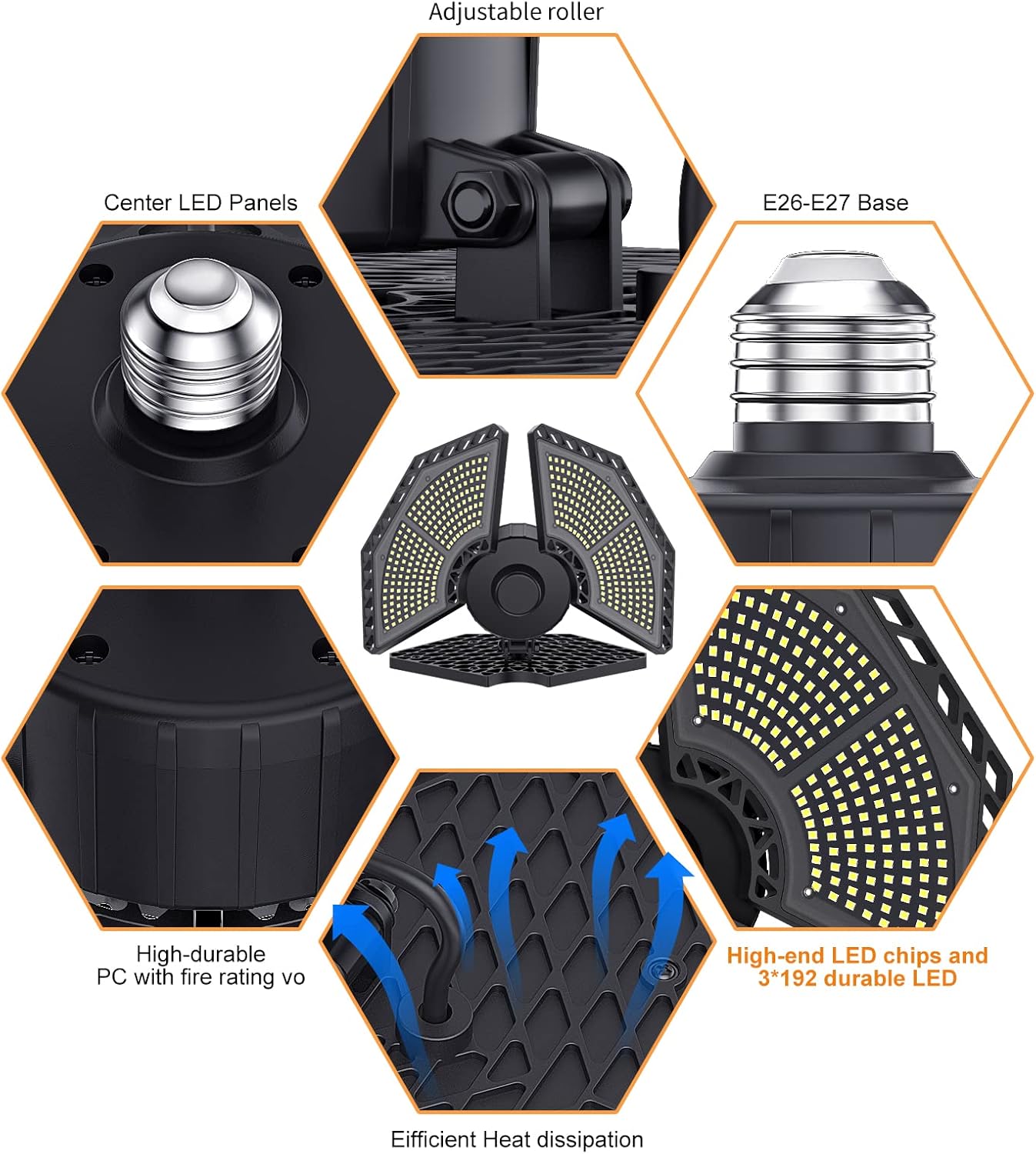 - 💡BRIGHT LED GARAGE LIGHTS💡 This garage light equips 3 ultra-bright adjustable LED heads with 576 PCS LED chips, it provides total 18500 lumens, 6000K daylight source and CRI> 80Ra color rendering index, which helps you get clearer vision and reduce visual fatigue with the best indoor lighting environment.