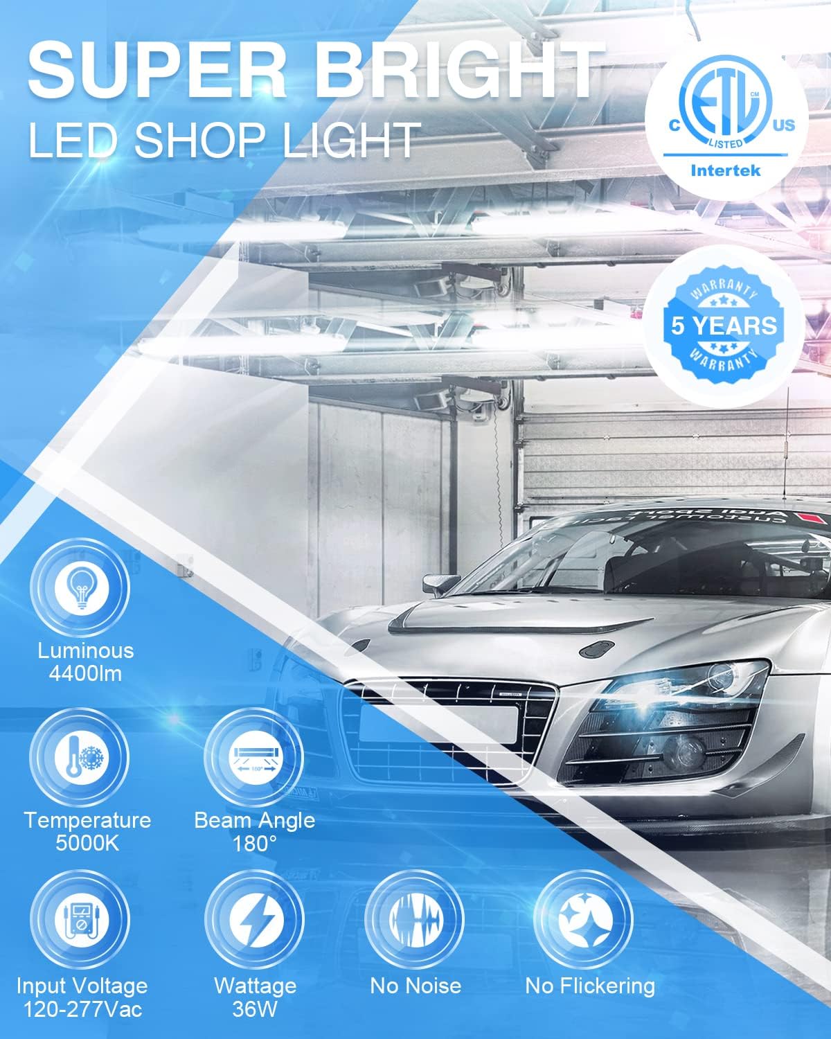 - đź’ˇSuper Bright - Our 4 ft shop light can provide 4400 high lumens with only 36W. It is an amazing LED efficiency of 122 lm/w! Excellent replacement for old fluorescent lamps! Energy saving of up to 80%.