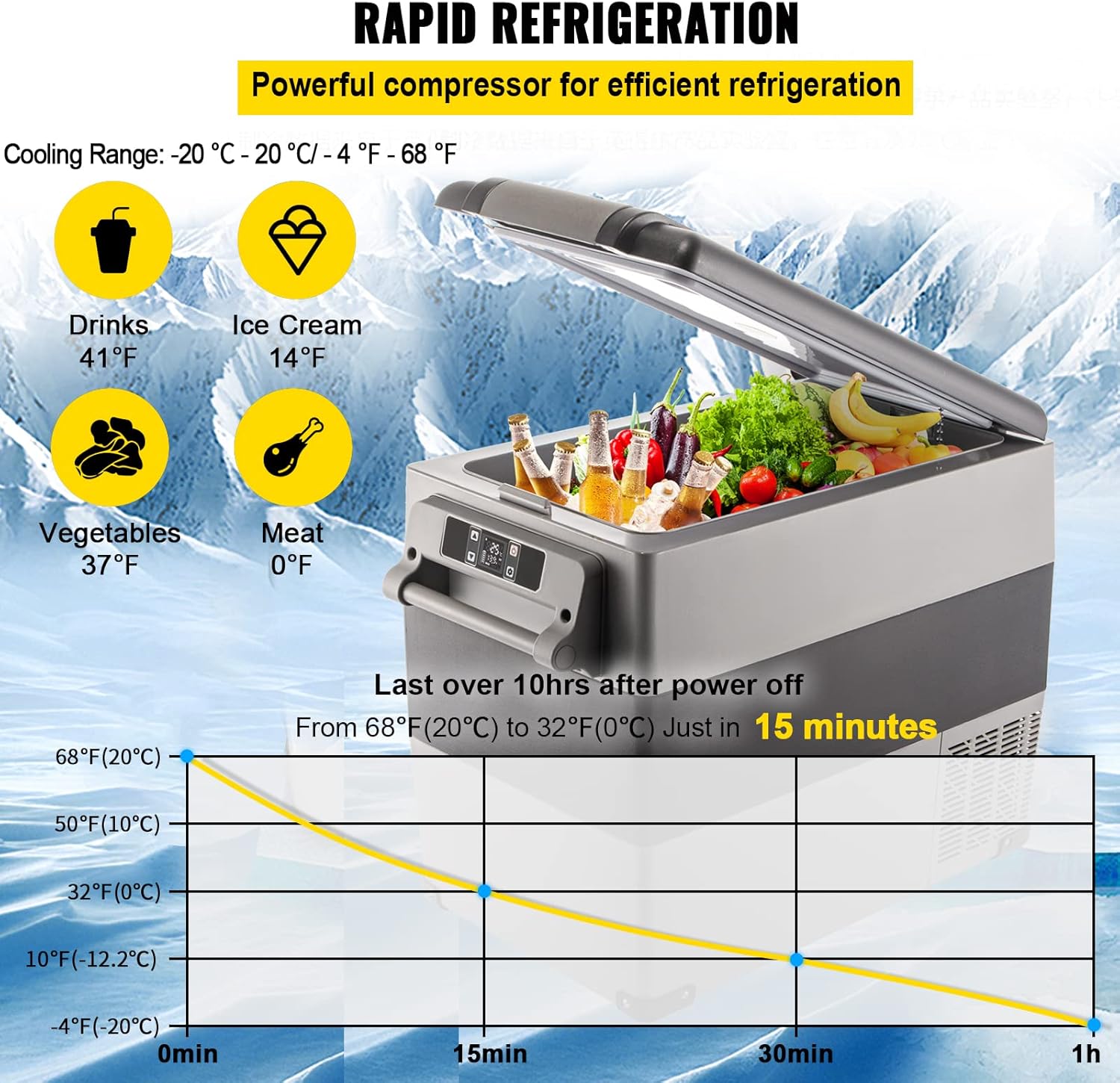 - Efficient Refrigeration: With Compressor refrigeration technology, this 12v car freezer could achieve fast cooling from -20℃ - 20 ℃/-4 ℉ - 68 ℉, keeping your food fresh. Perfect for travel, picnic, barbecue, camping, and parties.