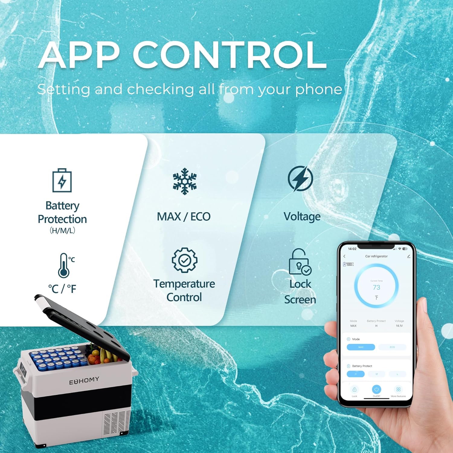 EUHOMY 12 Volt Refrigerator, 59QT(55L) Electric Cooler, 12V Fridge APP Control, 12V Cooler -4℉~68℉, Portable Freezer 12/24V DC 110-240V AC for Camping, Travel, Truck, Home