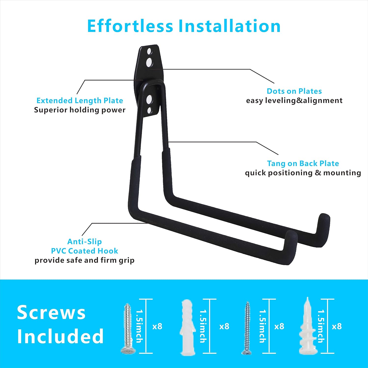 - 【Quantity】4 pack 7.5-inch long bar wall mount garage hooks with 2 pack nylon extension cord storage strap.