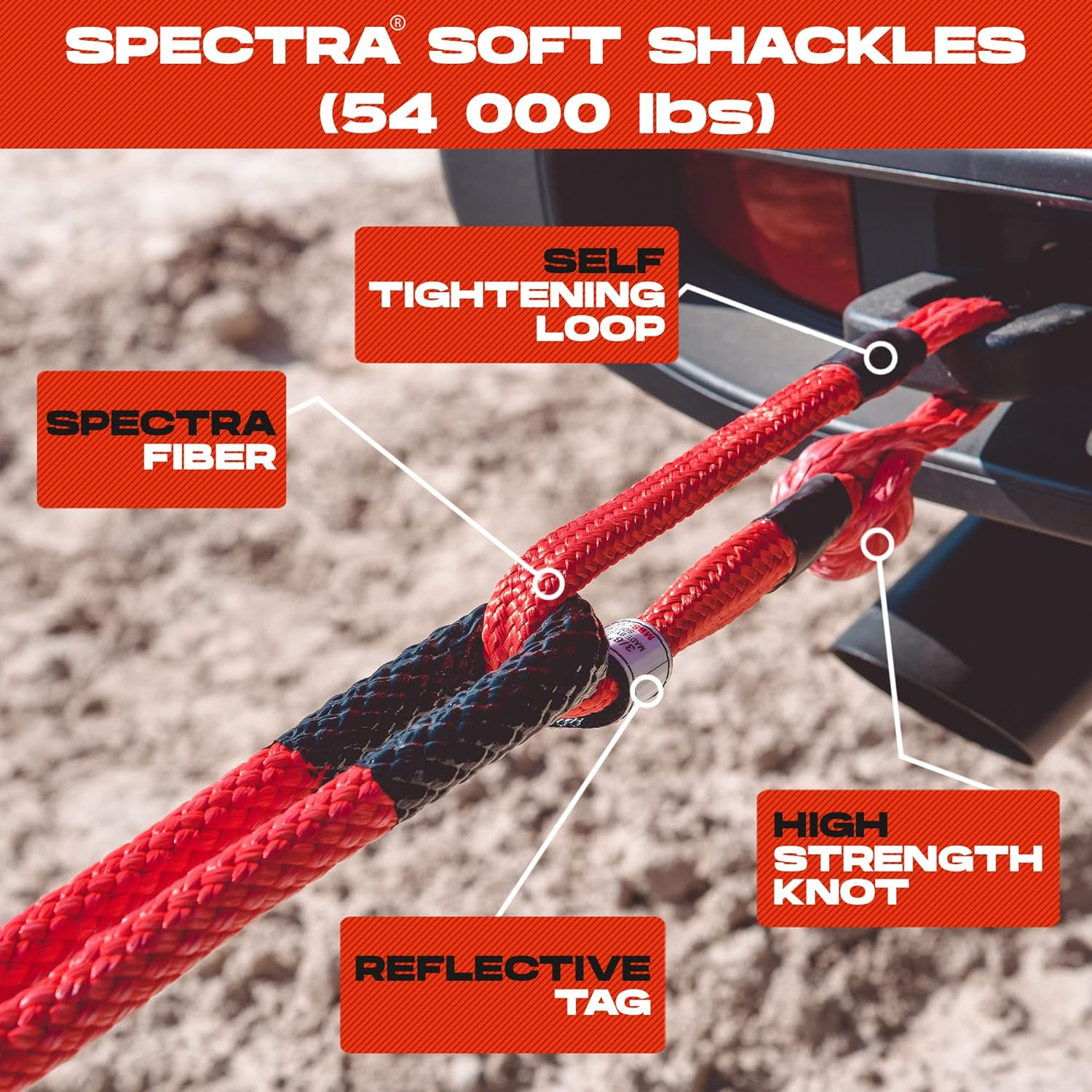 MiolleGear Heavy Duty Kinetic Recovery Tow Rope (Firecracker RED, 1-1/4"x30) (53000 lbs) with 2 Soft Shackle USA Spectra 9/16' x 10" (54000 lbs)