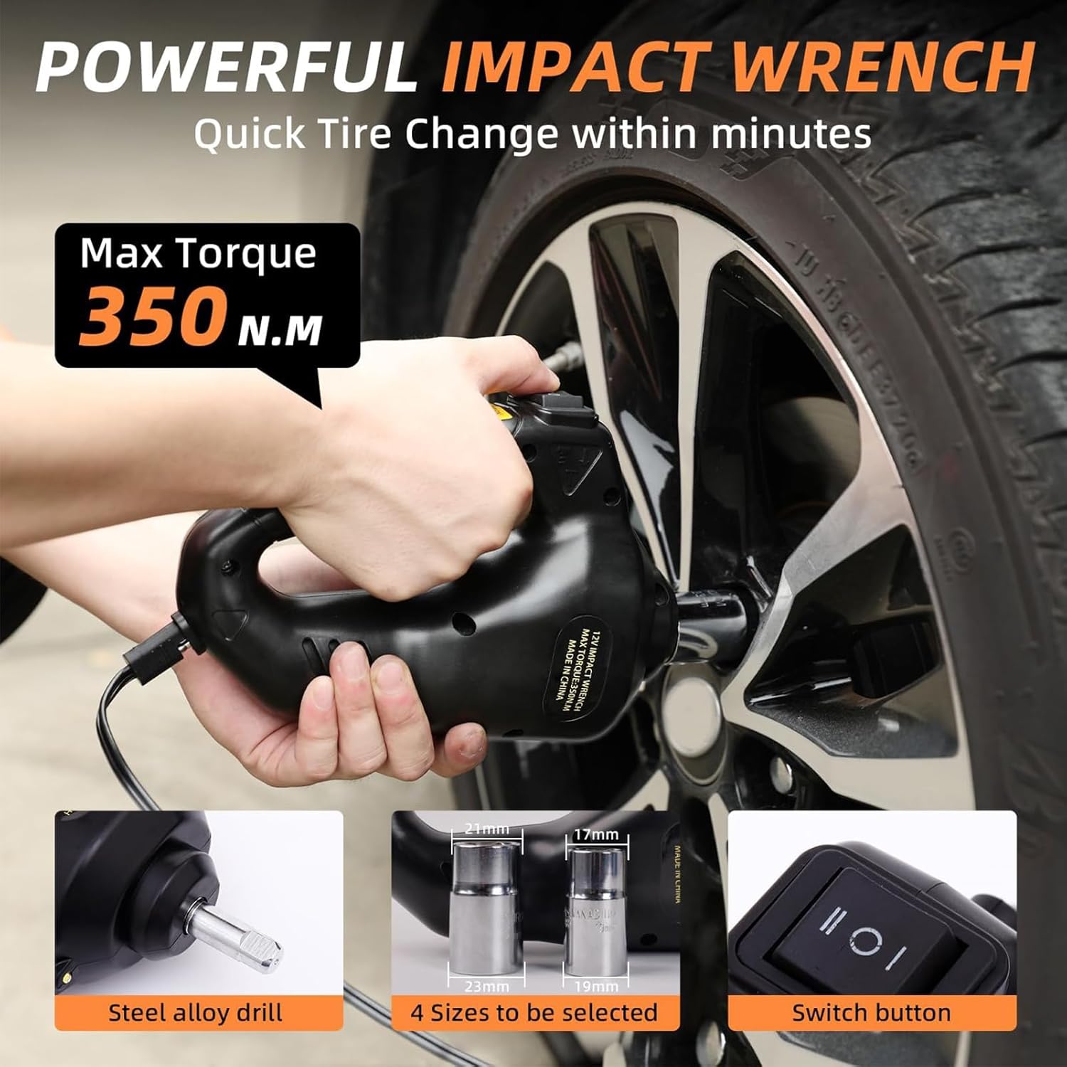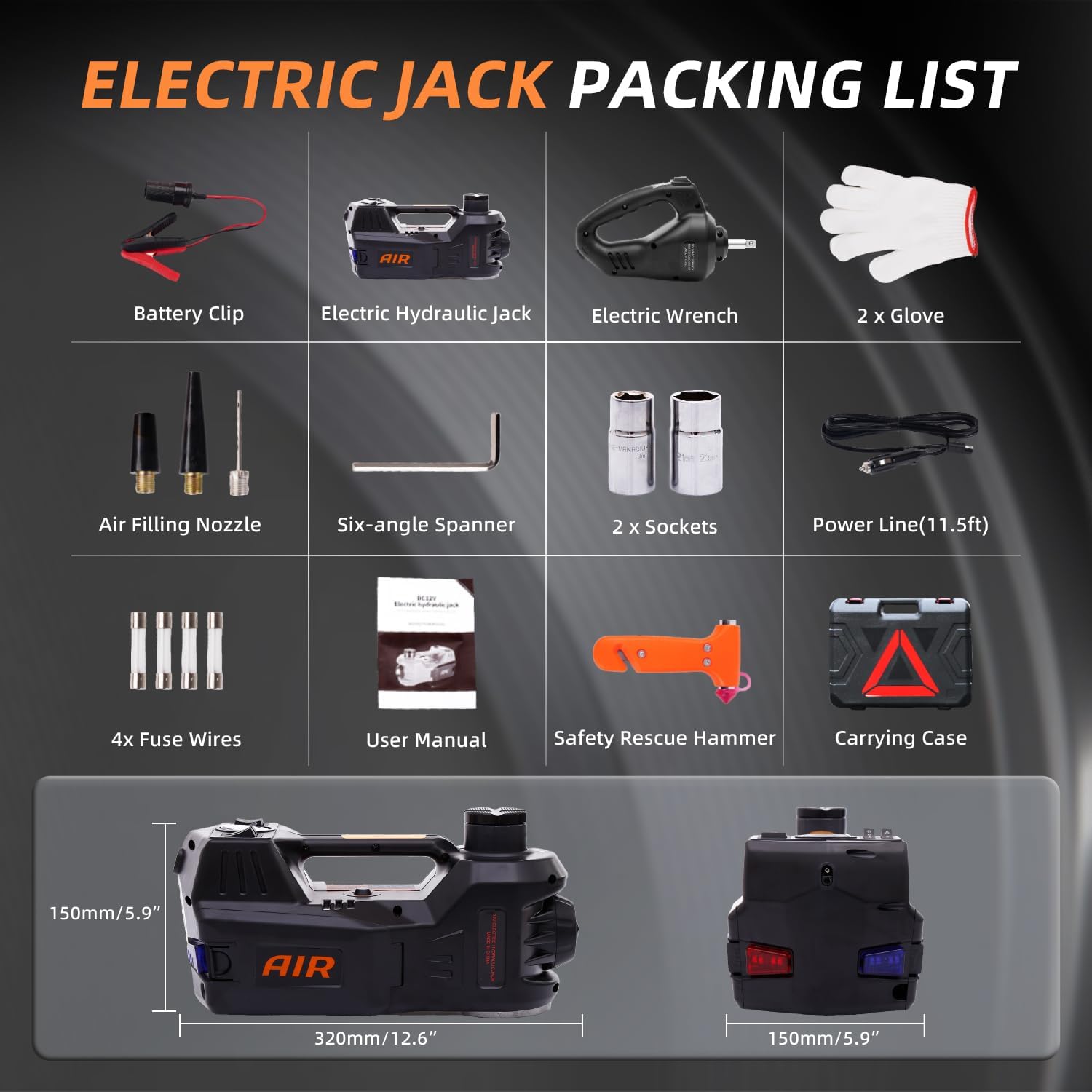 - Complete Car Jack Kit: Including electric car jack, automotive electric impact wrench, safety hammer, plastic case, 3.5m power cable, power clamp with wire, pair of gloves, user manual, etc. Very portable and easy to use