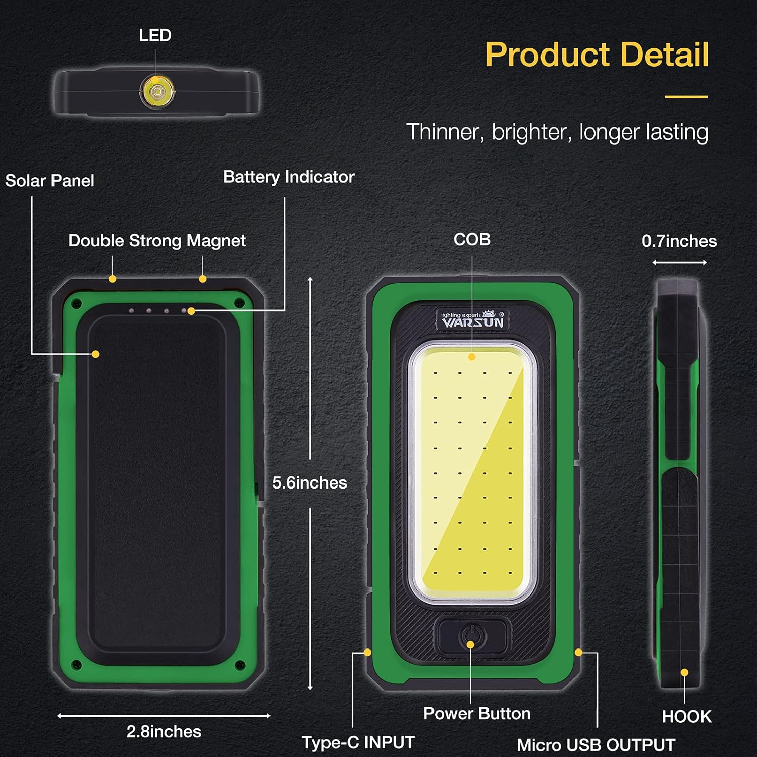 WARSUN Led Rechargeable Portable Magnetic Waterproof Solar Flood Light for Outdoor Camping Hiking Emergency Car Repairing (USB Charging, Green)