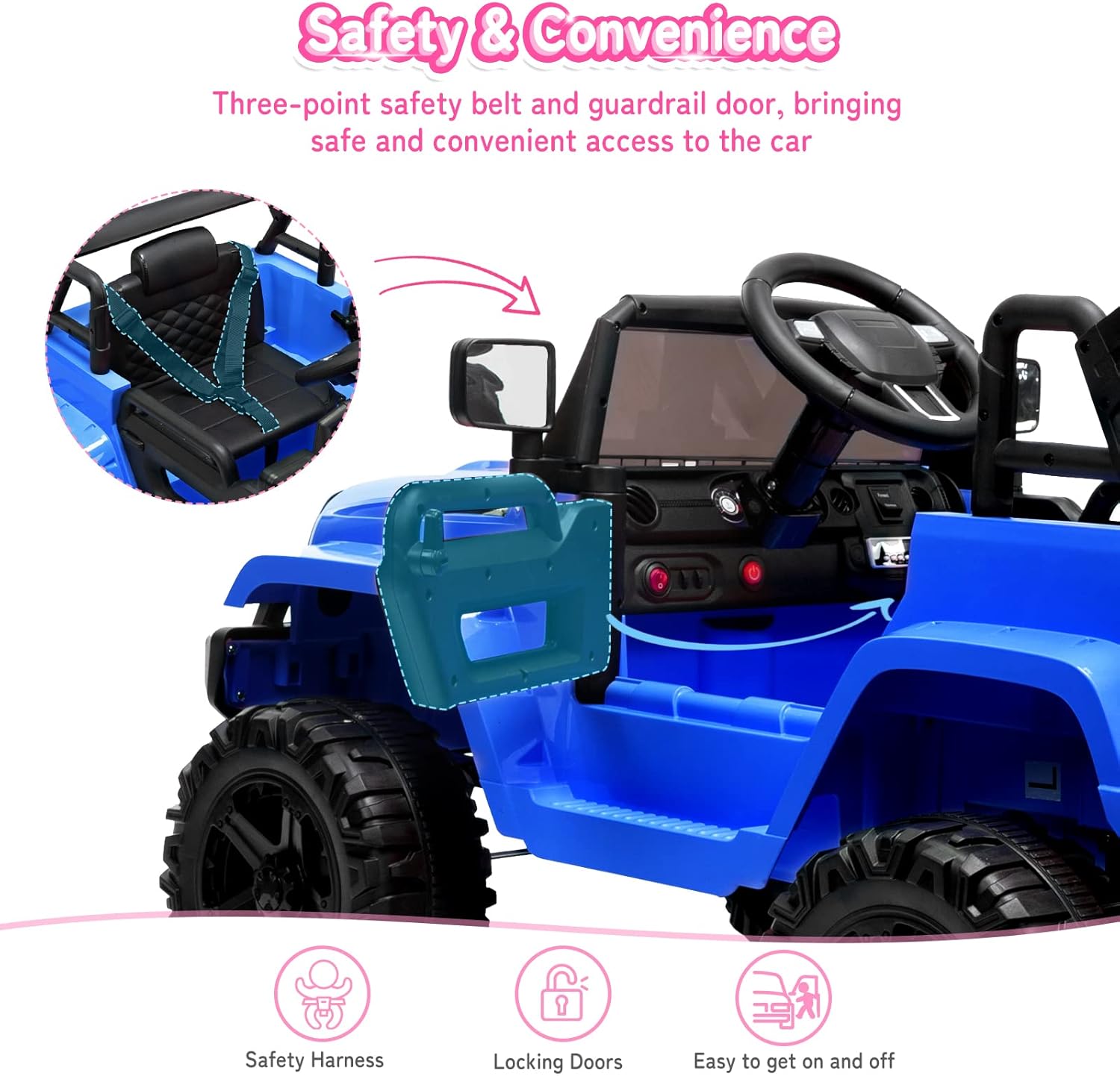 - Considerate Measures for Safety: Adjustable safety belt with a buckle to prevent your girl from falling off. Openable door for you girl to easy get on and off the car. Besides, you will know the time to recharge according to the battery display next to the volume buttons.