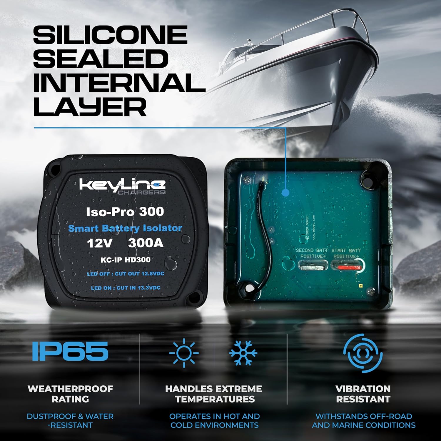 - Unlike other isolators on the market, the Keyline Pro HD Automatic 300 Amp Dual Battery Isolator is IP65 Certified. This international Protection rating means that your Keyline isolator is safe for use even for your off-road needs in dusty, wet, and unexpected extreme weather environments. This compact battery isolator was built ultra-small to fit almost anywhere! A perfect fit under the hood or anywhere to get close to your batteries.