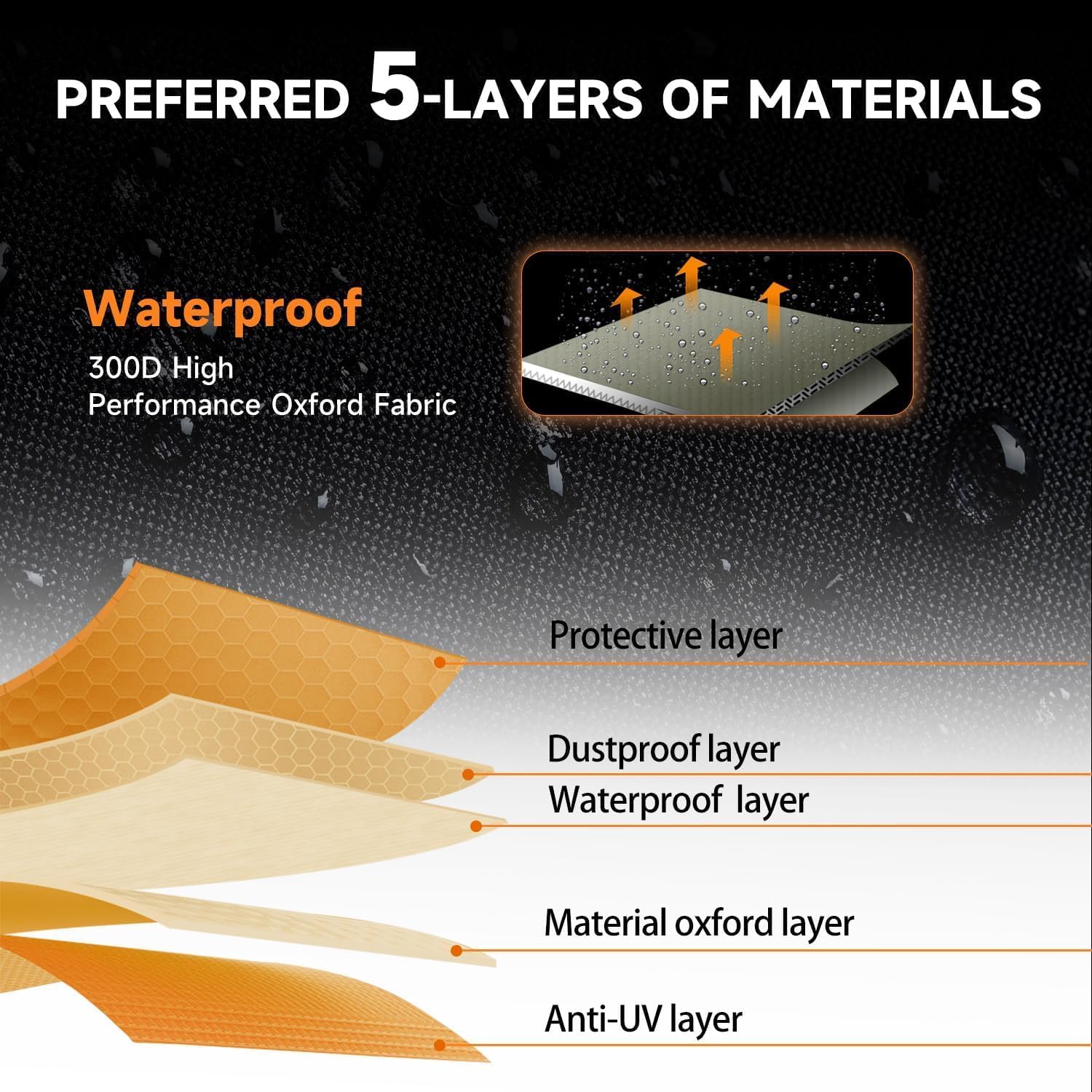 - Sturdy & High Performance Cover: Made with Denier Oxford Cloth and double-stitched seams for year-round use; Our unique Heavy duty& Water repellent treated fabrics covers is protects against rain, wind, snow, sun, bird poop, tree sap and dirt and won't crack in cold weather, protect UTV from sun,rain,water damage. NOTE: Not recommended for trailering