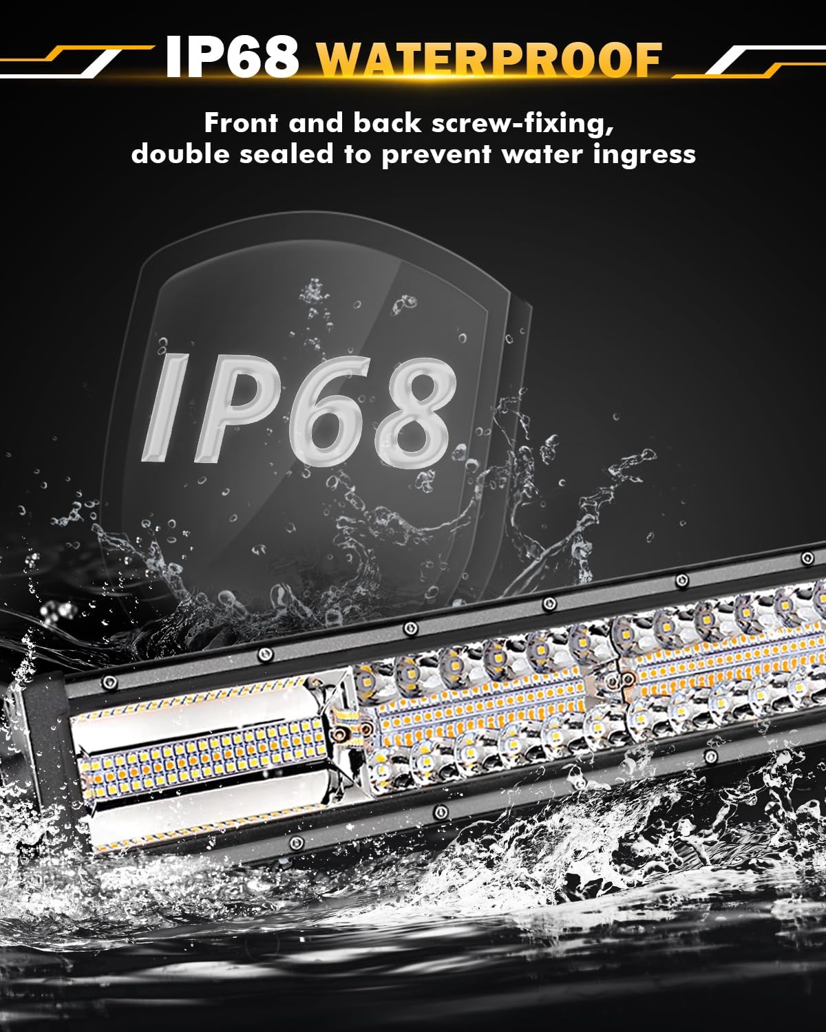 - 【IP68 WATERPROOF RATE】6 modes light bar built-in IP68 waterproof adopts upgraded waterproof die-casting aluminum housing and advanced sealing technology to withstand any harsh environments and weather conditions. Also, our lights are with built-in no electromagnetic interference (EMC), resolve the issue of radio interference and flickering