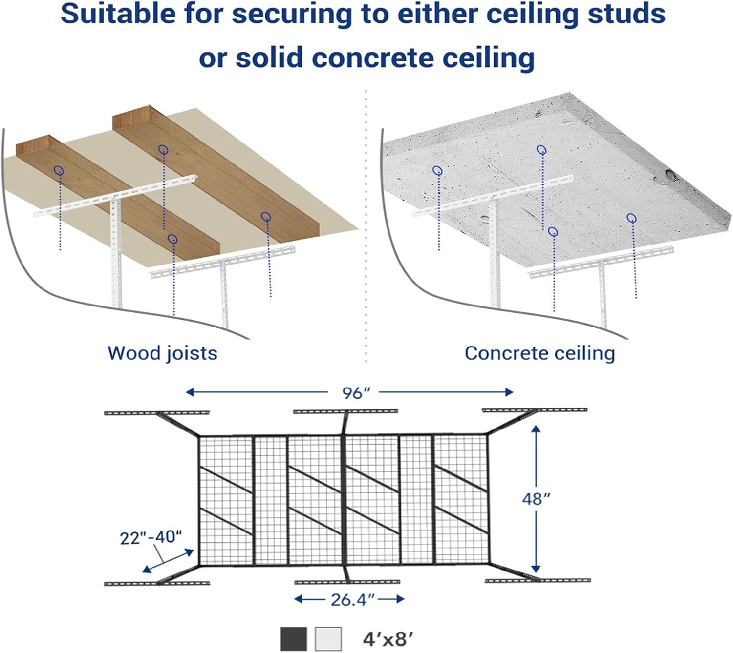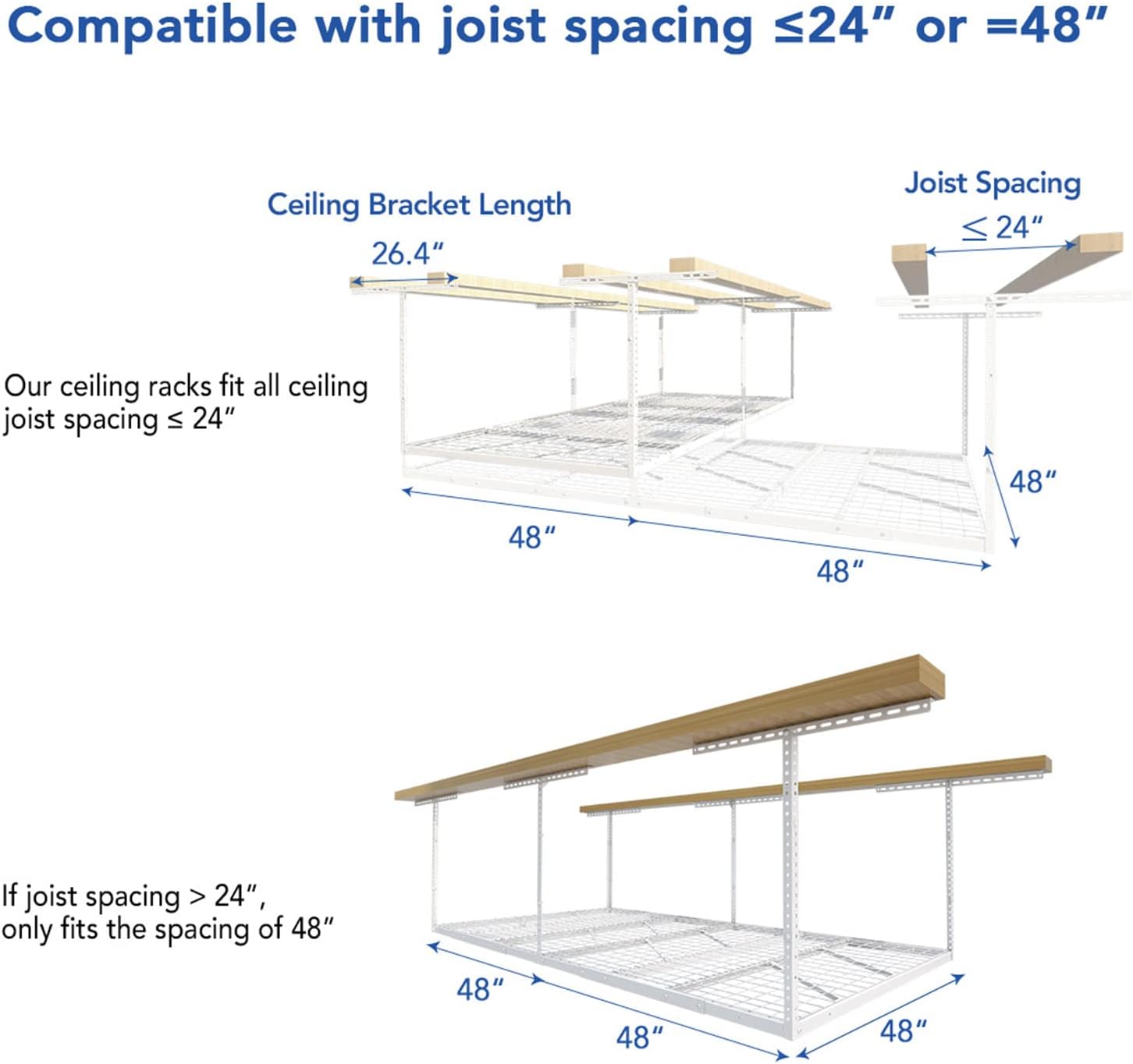 - DIY INSTALLATION:Installation template helps make plan.This overhead storage rack fits all ceiling joist spacing ≤ 24",if joist spacing > 24",only fits the ceiling spacing of 48".